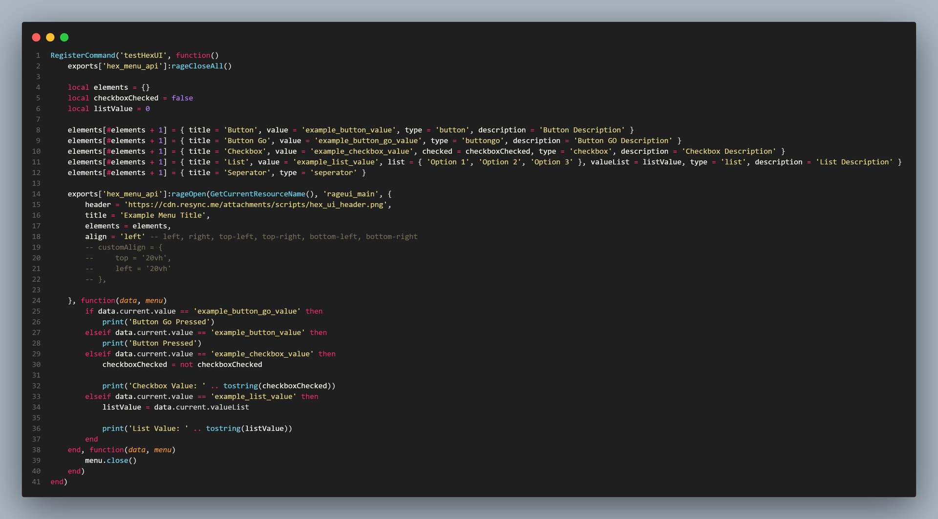Instead of traditional LUA menus like RageUI, NativeUI & WarMenu that render directly in the game process, HEX MENU API renders menus externally via React/CEF, offering superior performance, modern styling, and complete CSS customization.
