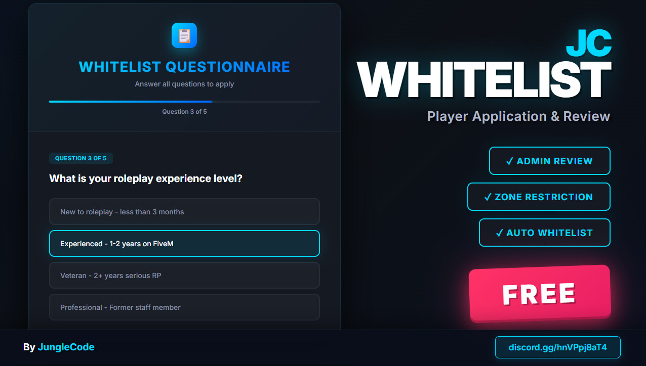 A whitelist application system for FiveM servers with interactive questionnaire, admin review panel, and zone restriction.