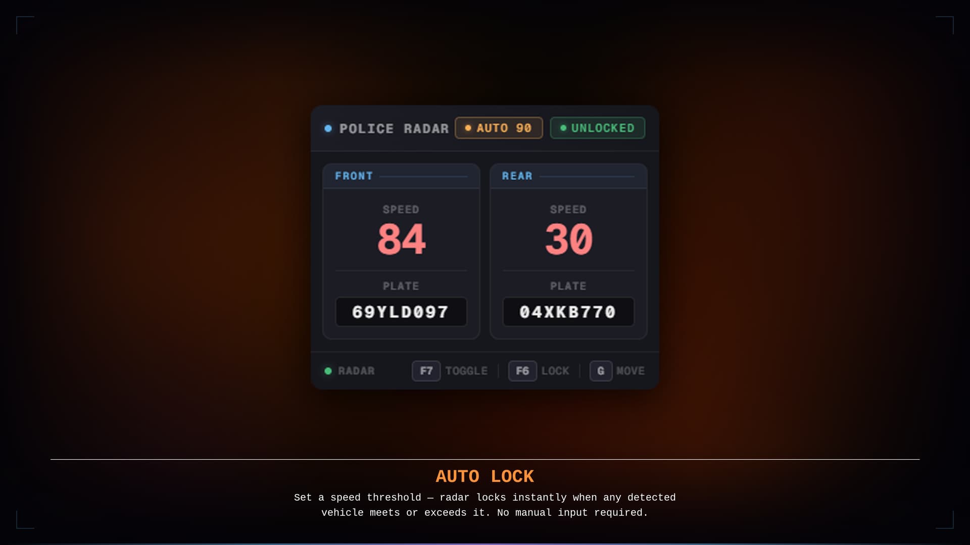 Auto-lock / speed clocking — set a minimum speed threshold with /radarspeed [speed]; the radar locks itself the instant any detected vehicle meets or exceeds it -