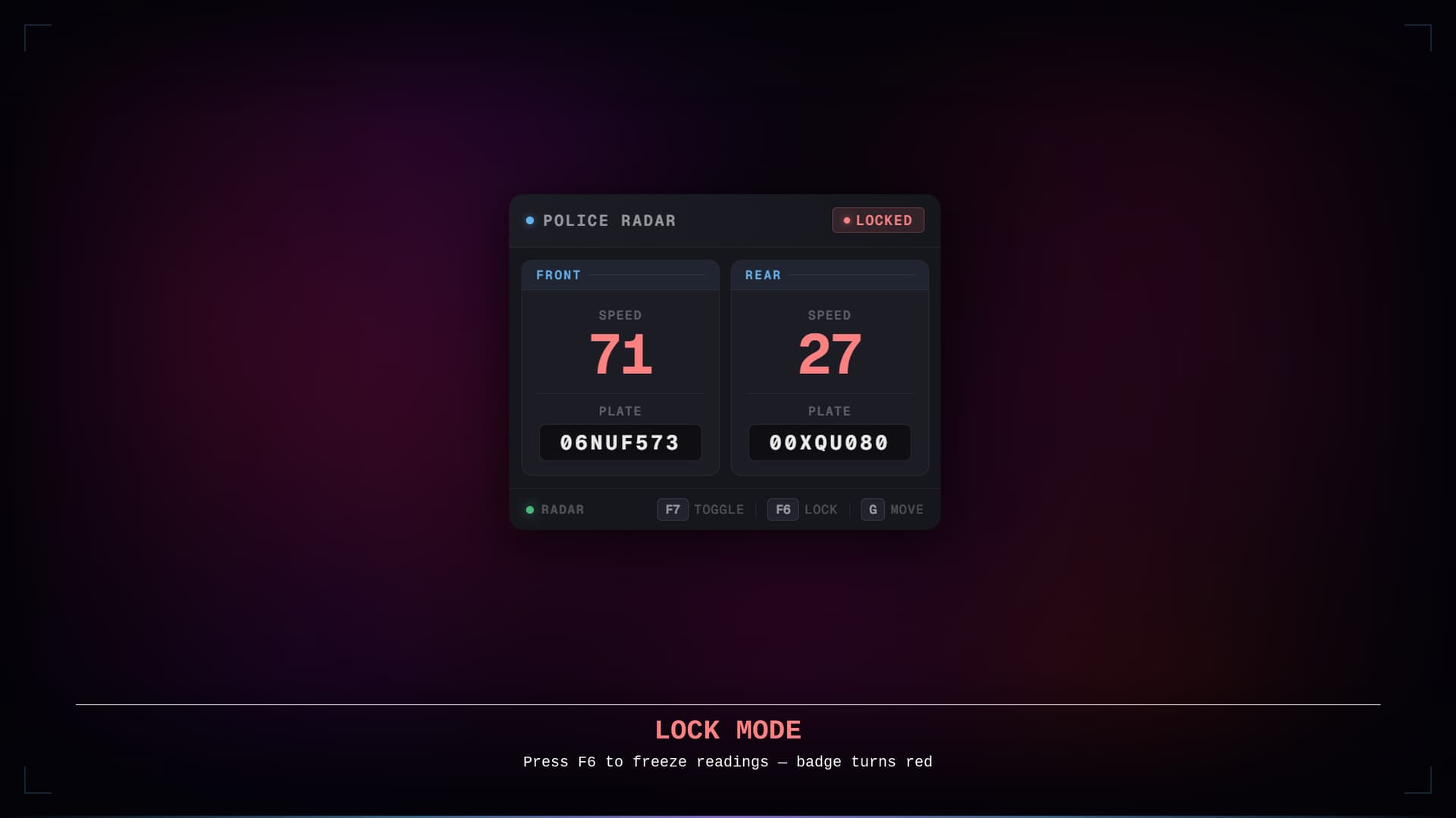 The panel is fully draggable and remembers its position between sessions. A minimum speed threshold can be set with /radarspeed — the radar locks itself the instant any detected vehicle meets it, freezing the reading for review without any manual input.