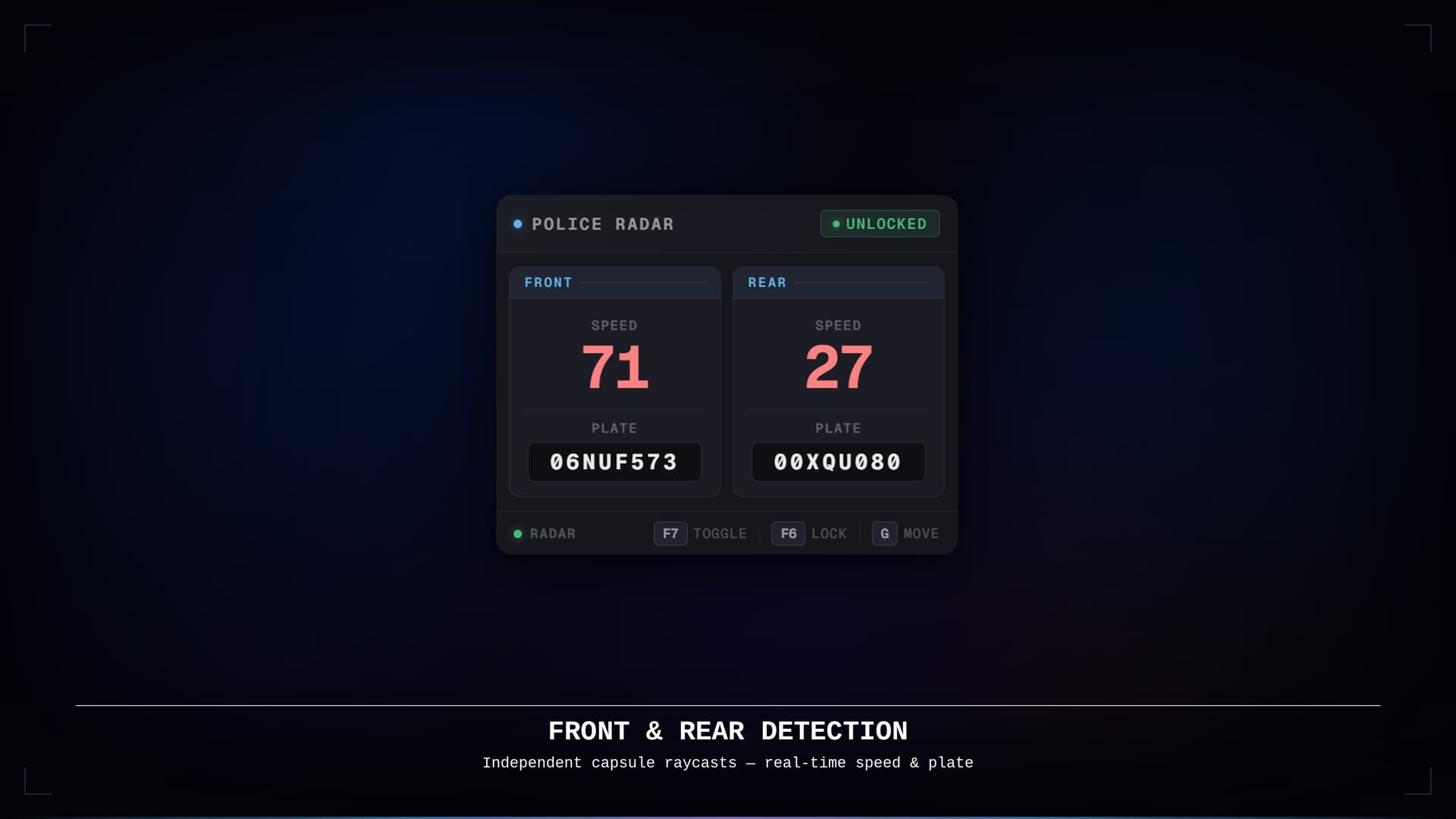 LGD PoliceRadar is an always-on radar HUD that displays the speed and plate of vehicles ahead and behind you — directly on screen, no menu required. The panel activates automatically whenever an emergency vehicle is entered and fades out on exit, keeping the experience entirely hands-off.