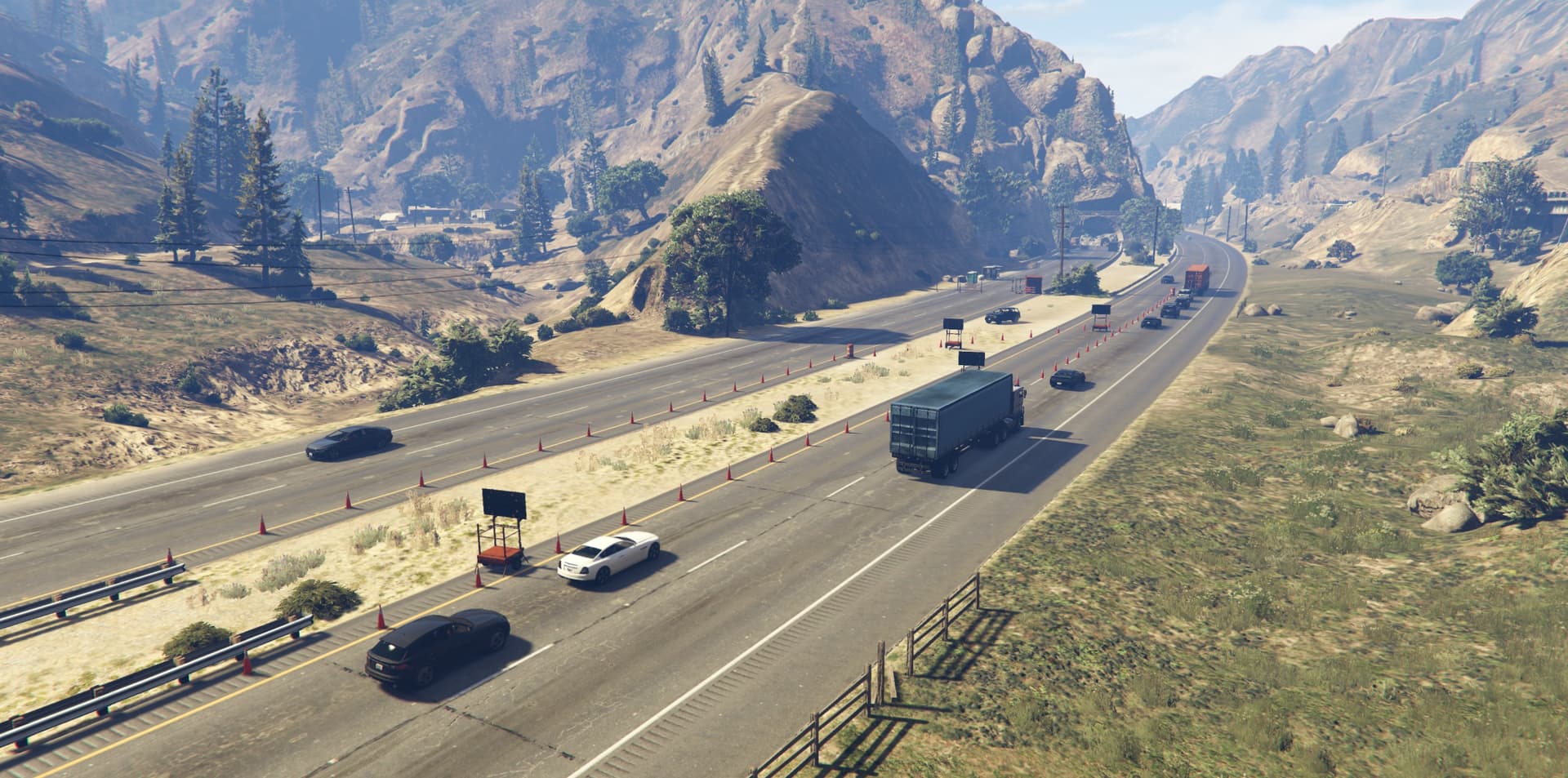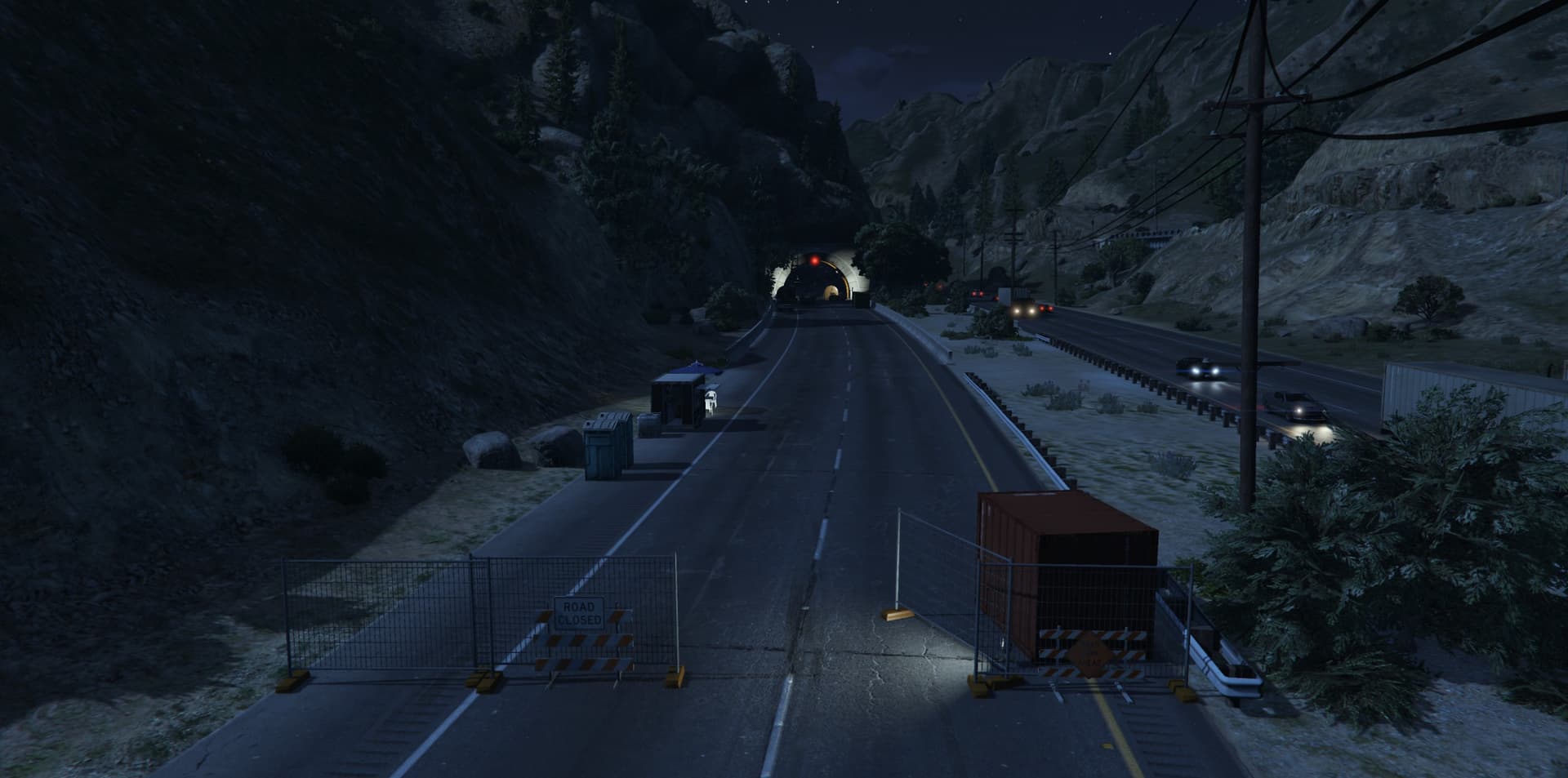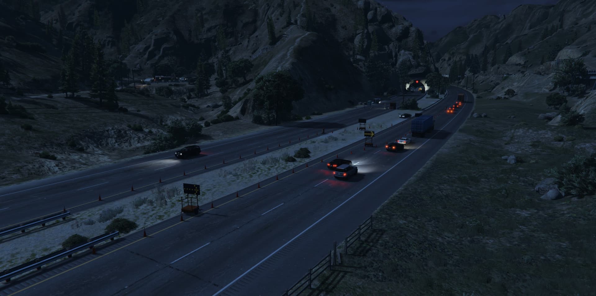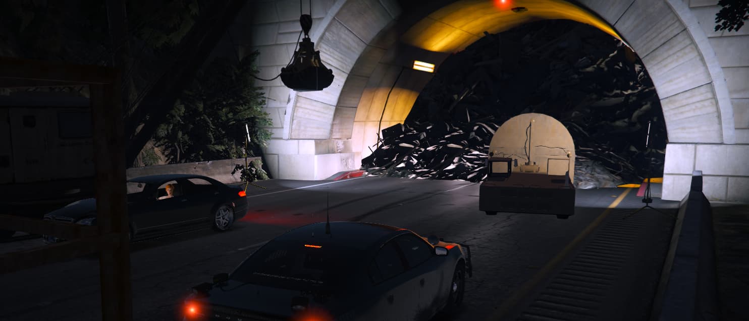 I collapsed the Braddock Pass Tunnel to the north and set up a construction site at both tunnel entrances. The tunnel is now impassable and all traffic is diverted onto the parallel carriageway. The construction site is deliberately designed, with construction vehicles at the tunnel entrances to add realism. The diversion leads to increased traffic and traffic jams, which makes passage more difficult and chases particularly exciting.