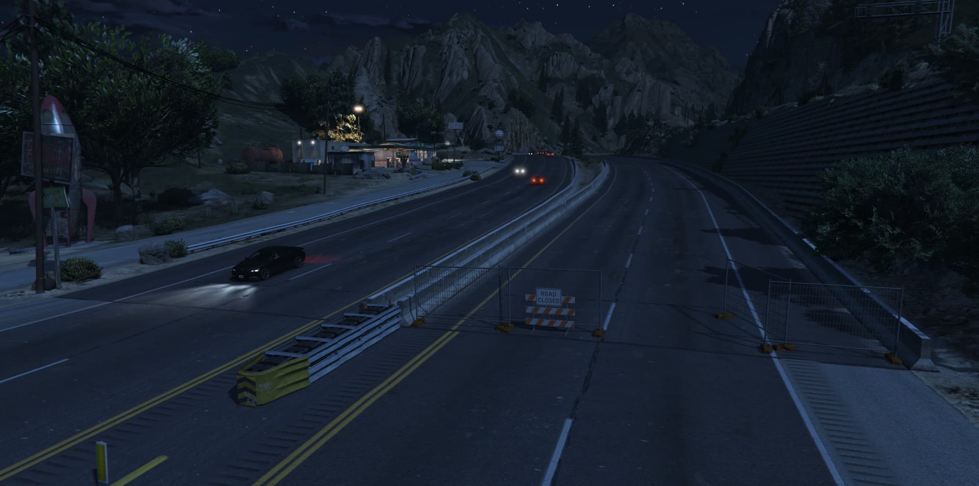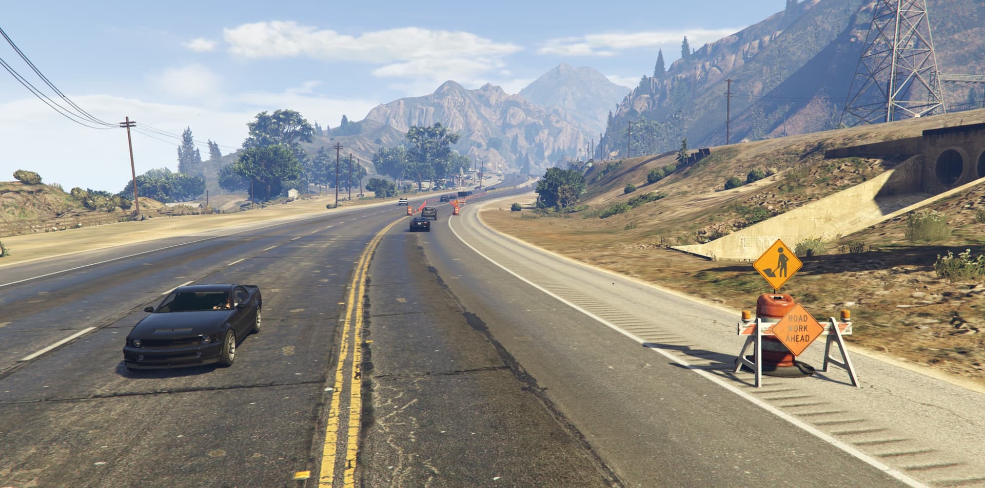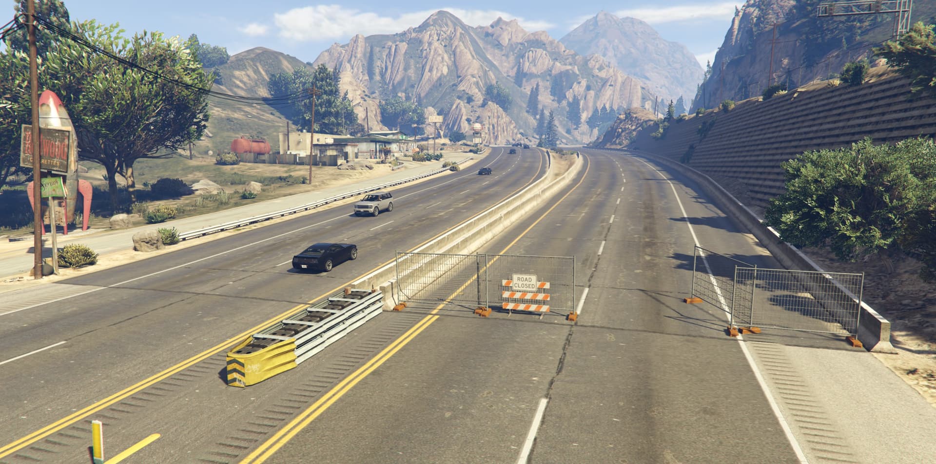 I collapsed the Braddock Pass Tunnel to the north and set up a construction site at both tunnel entrances. The tunnel is now impassable and all traffic is diverted onto the parallel carriageway. The construction site is deliberately designed, with construction vehicles at the tunnel entrances to add realism. The diversion leads to increased traffic and traffic jams, which makes passage more difficult and chases particularly exciting.