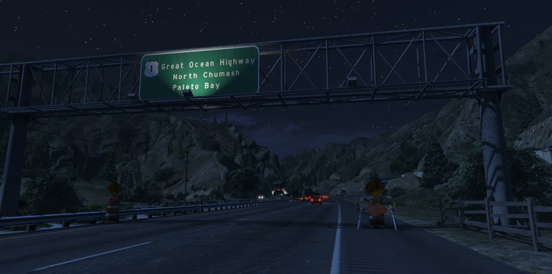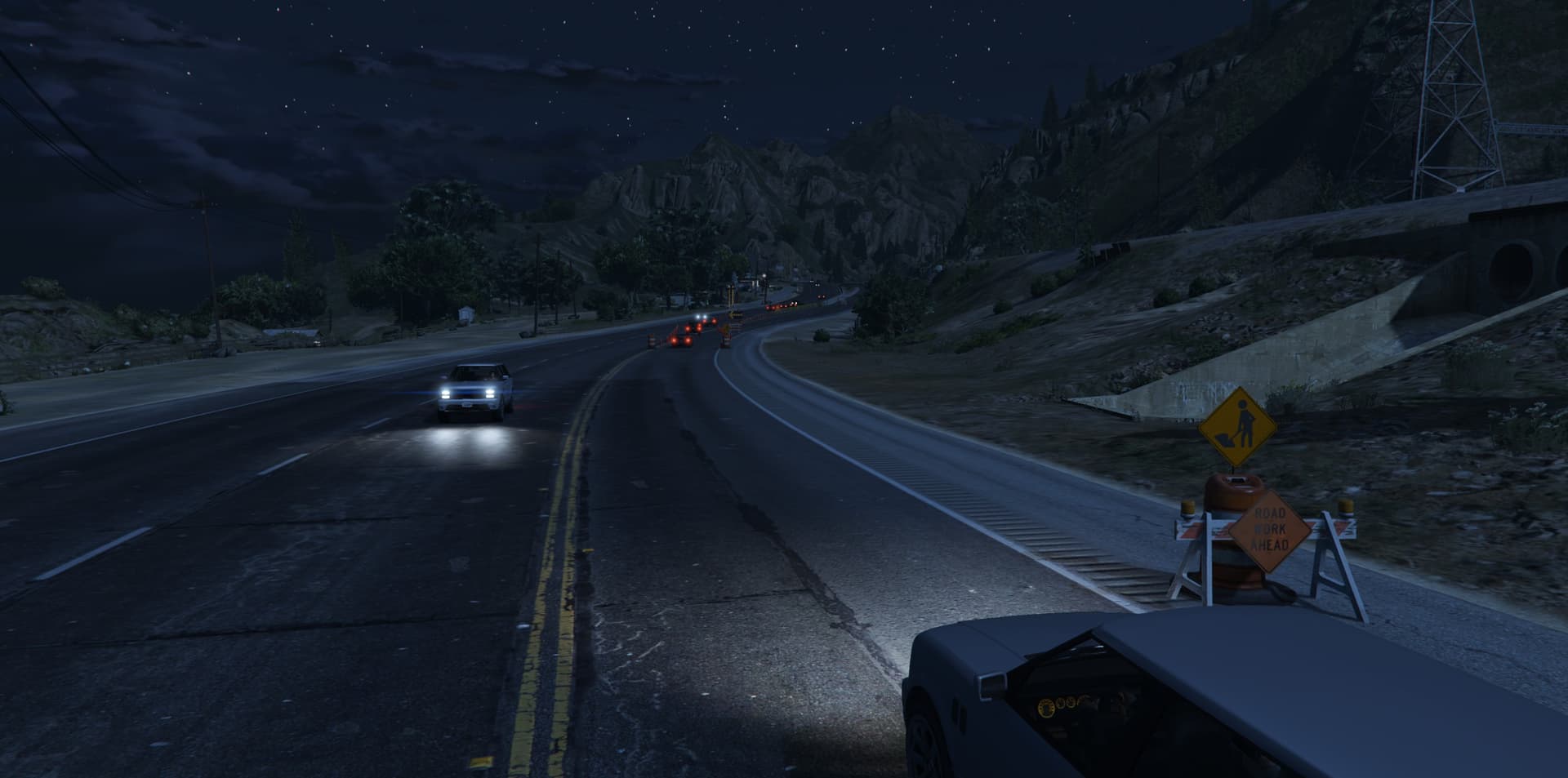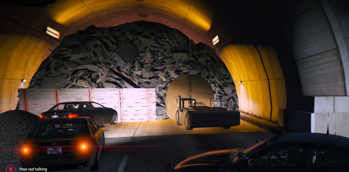 Ich habe den Braddock-Pass-Tunnel im Norden zum Einsturz gebracht und an beiden Tunneleingängen eine Baustelle eingerichtet. Der Tunnel ist nun unpassierbar und der gesamte Verkehr wird auf die parallele Fahrbahn umgeleitet. Die Baustelle ist bewusst gestaltet und sorgt mit Baufahrzeugen an den Tunneleingängen für mehr Realismus. Durch die Umleitung kommt es zu erhöhtem Verkehr und Staus, was die Durchfahrt erschwert und die Verfolgungsjagden besonders spannend macht.