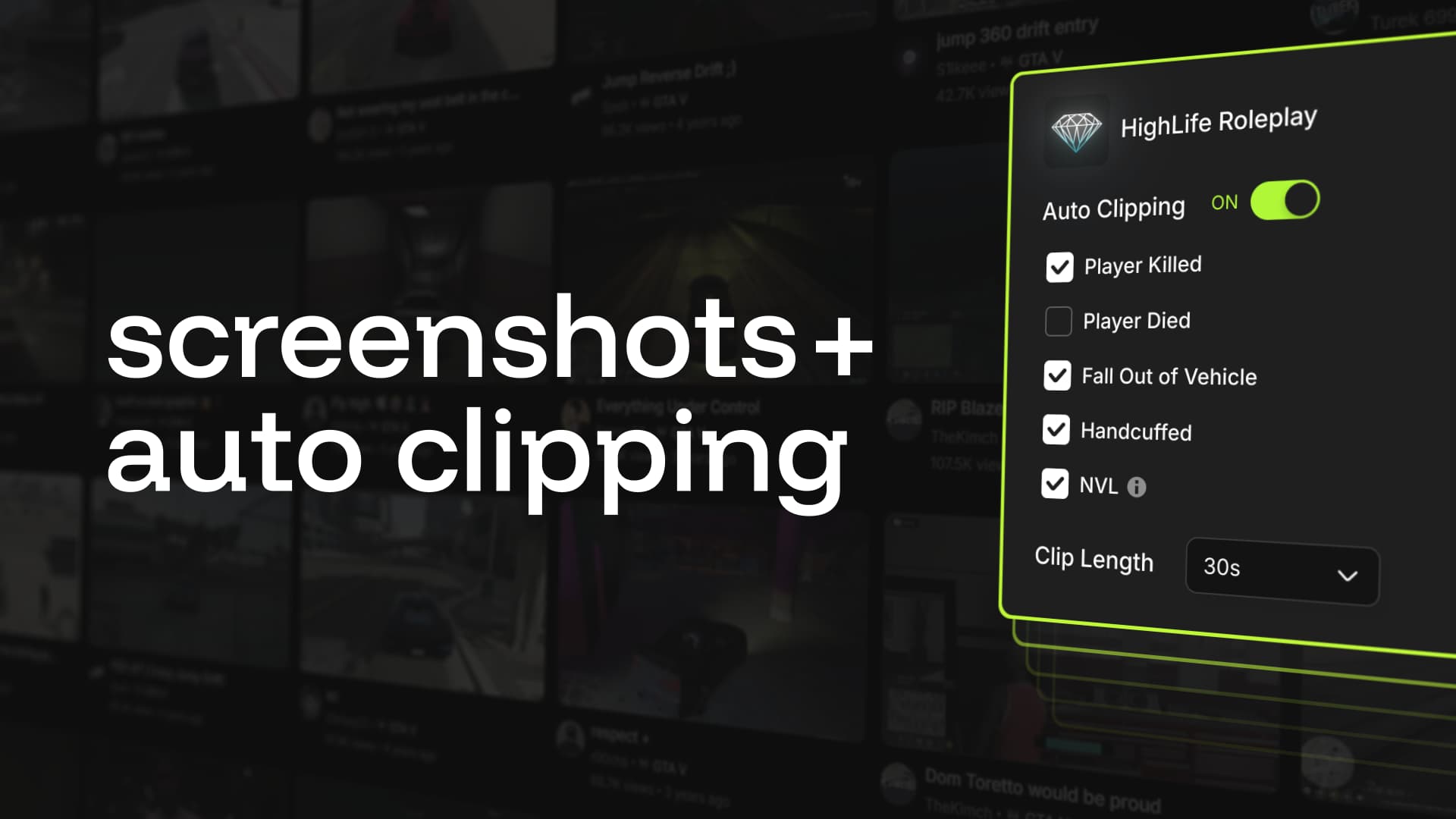 Help your players take lagless screenshots and create automatic clips. This FiveM server resource integrates with the Medal desktop client to capture server-specific gameplay clips and screenshots without lag. It supports automatic capture based on in-game events, configurable via an in-game menu.