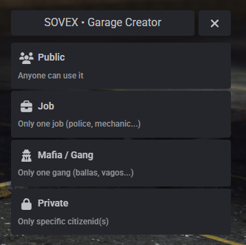 Versatile Garage Types – Support for Public, Job, Gang, and Private garages.