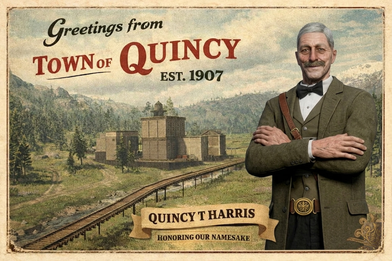 βWelcome to the town of Quincy, est. 1907. Named after the legendary southern general, Quincy T. Harris. The town is located in the Little Creek River region.β