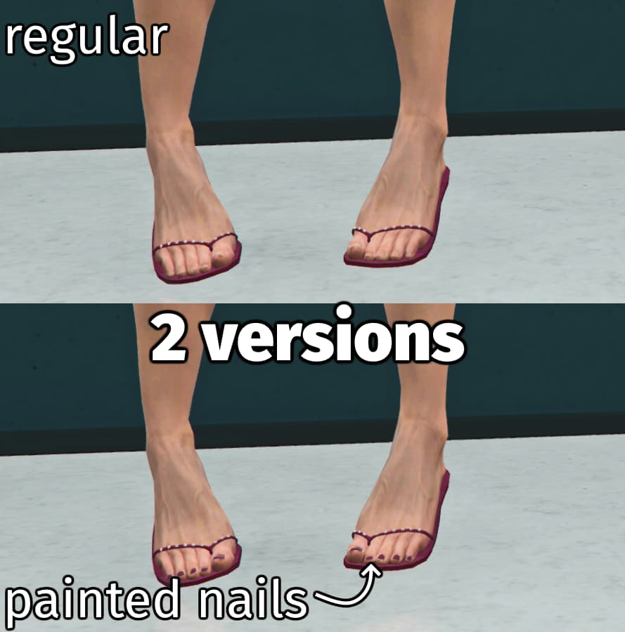 A mesh edit of shoes 014 featuring a strap across the toes with little pearls. Comes in 6 textures. Comes in 2 versions, regular or with painted toenails. You can install one or both. These are (_r) skintone compatible.