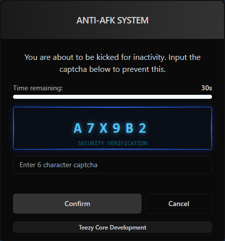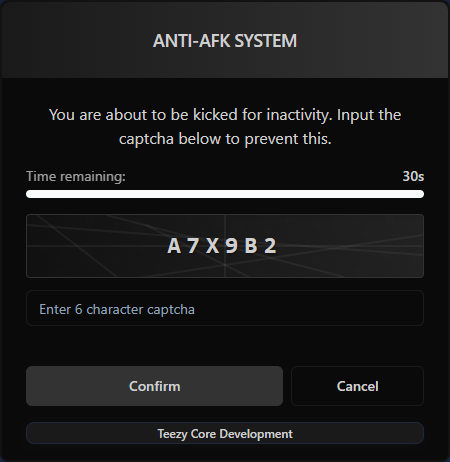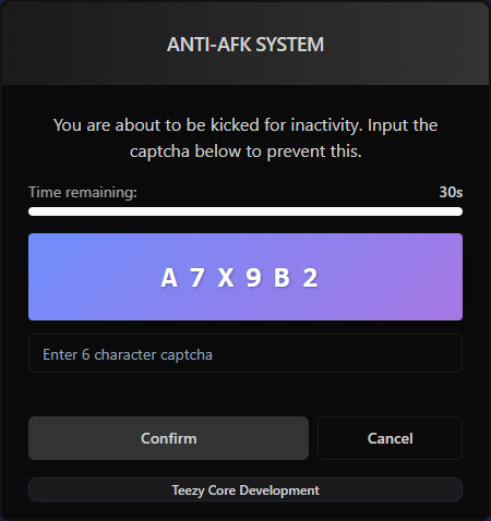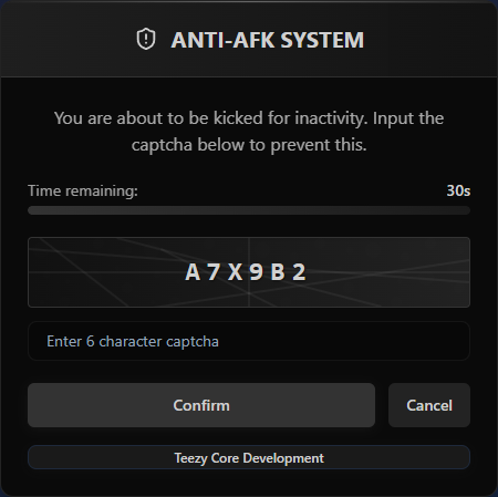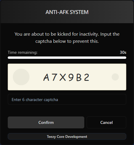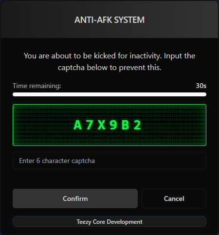 This is a Anti-AFK system for FiveM servers that detects inactive players and presents them with a captcha challenge to prevent automatic kicks. This resource helps maintain server performance by removing idle players while giving legitimate players a chance to prove they’re still present.