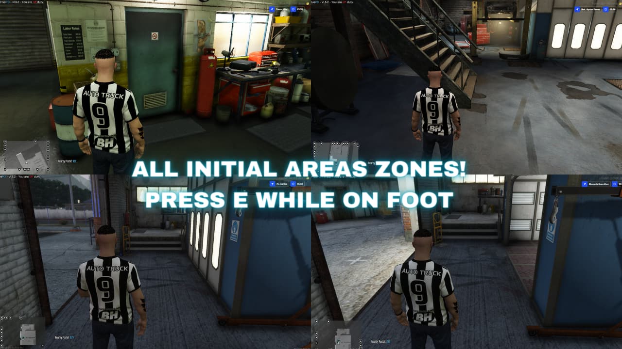 - Config.InitialAreas: Define specific areas where players can interact with mechanics by leaving their vehicles and pressing ‘E’. Each zone is set with precise coordinates in the