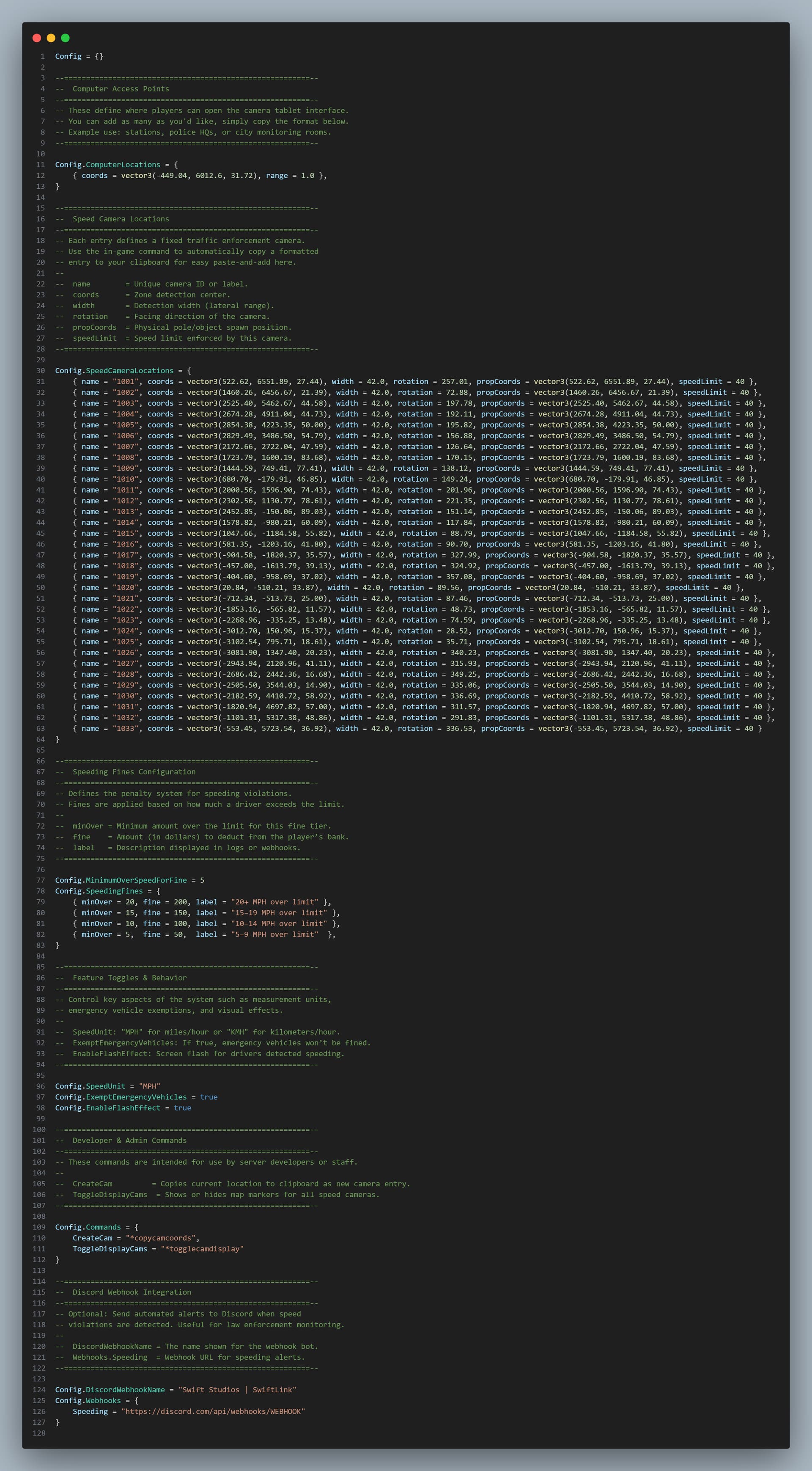 Developed by Swift Studios, it connects speed detection, live CCTV access, and automated Discord logging into one seamless, high-performance network for law enforcement and city authorities.