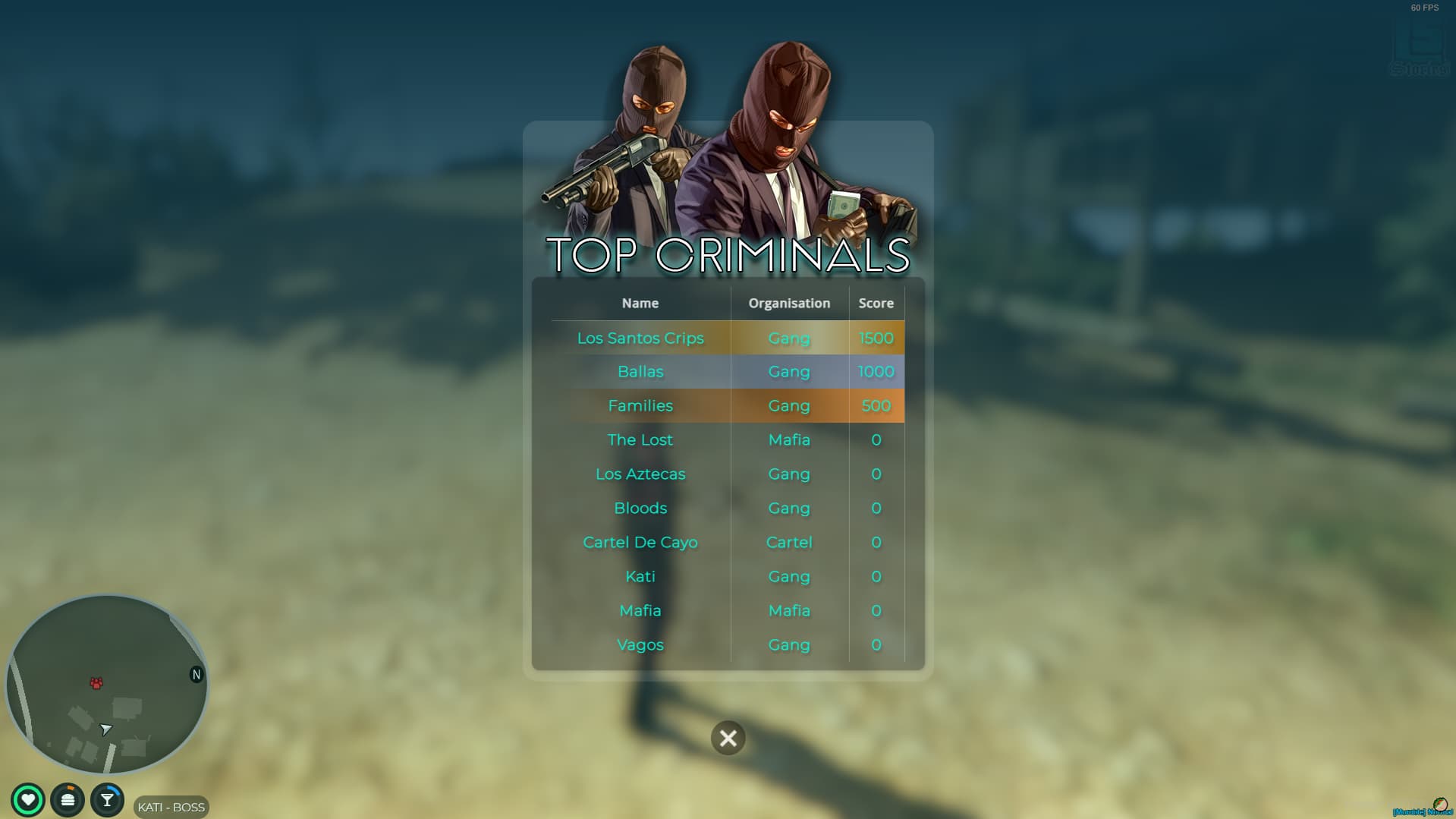 ● | A leaderboard to display and rank your servers Top 10 Criminal Organisations.