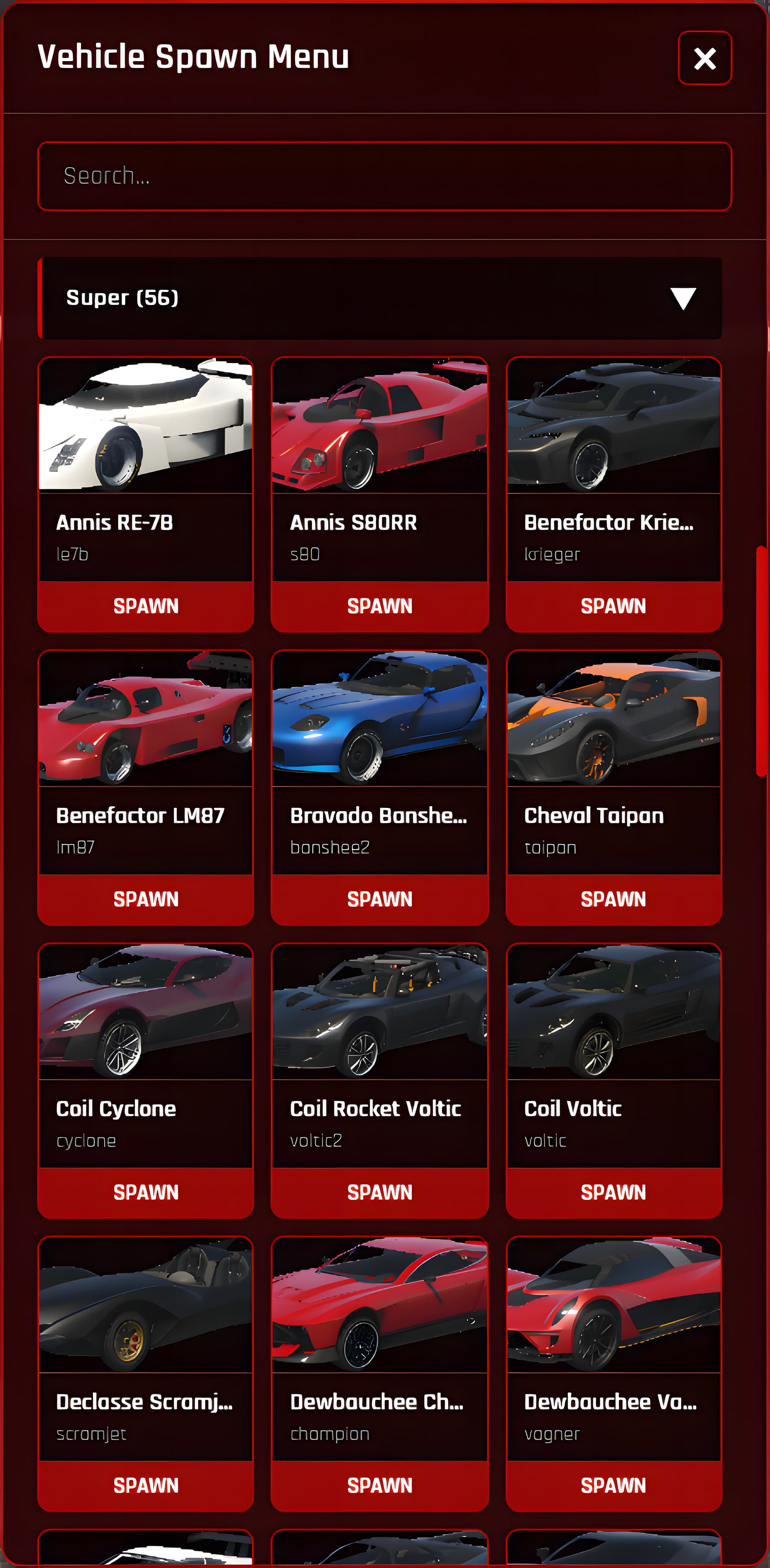 /vehiclemenucommand or pressF2(configurable) to open the interactive vehicle selection menu. - Browse & Search: Navigate through vehicle categories or use the search bar to find your desired vehicle.