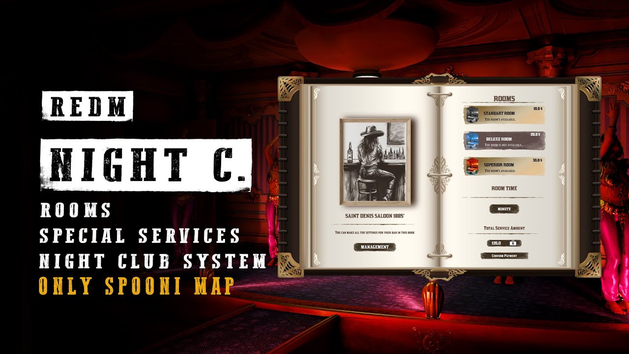 Hello, this script is compatible with spooni night club and has a system that turns your night club into a business where you can earn money, have dancers and private rooms. You can call private servants to your rooms. You can throw money to the ladies dancing on the stage and all earnings and money thrown goes to the night club owner’s coffers. You can look at the show times in our extremely high quality produced book and at the same time you can look at the room and maid details. This script provides a highly entertaining opportunity for RedM to experience some of your pleasures.