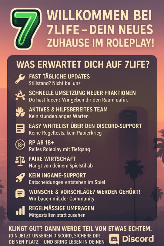 Dann willkommen bei 7LIFE – Roleplay mit echten Systemen, echter Arbeit und echtem Impact.