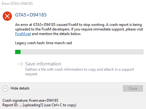 Play in any FiveM server for about 2 minutes up to sometimes 20ish minutes, then random crash, not script related, not server related, not related to any menu actions or anything I can possibly see a pattern of. I do have notably poor internet however, but that should not be an issue.