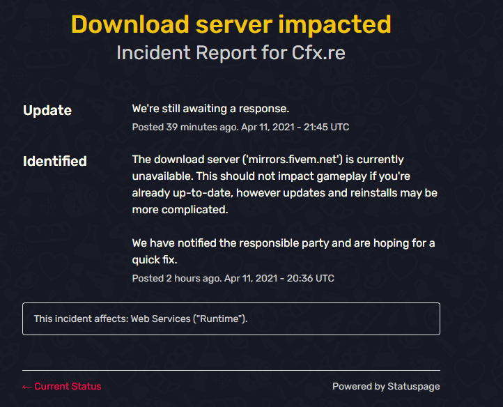 Oh hey! Yes thanks for the update. I went to that website earlier and I couldn’t connect to it. I found there website with live updates! https://status.cfx.re/
