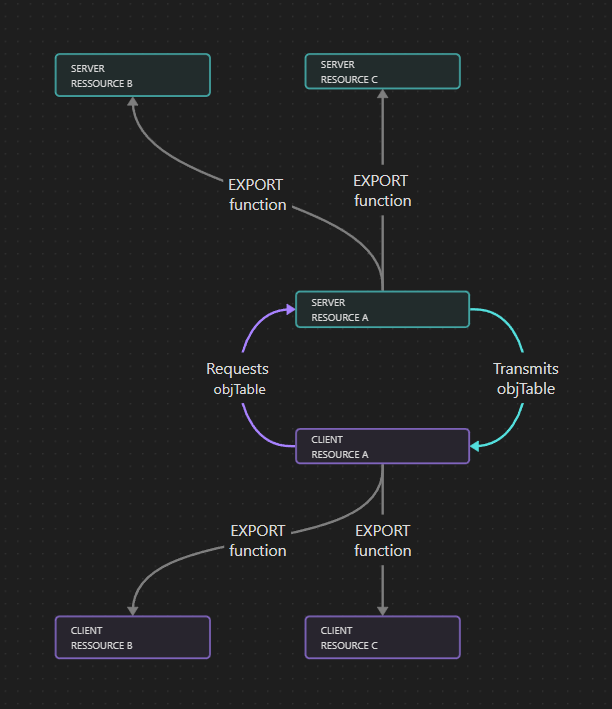 Currently, I always request data from the server via the client (NETEVENT) and then send the data from the server (also NETEVENT) to the client. From here, I transfer the data to the other resources using export functions.