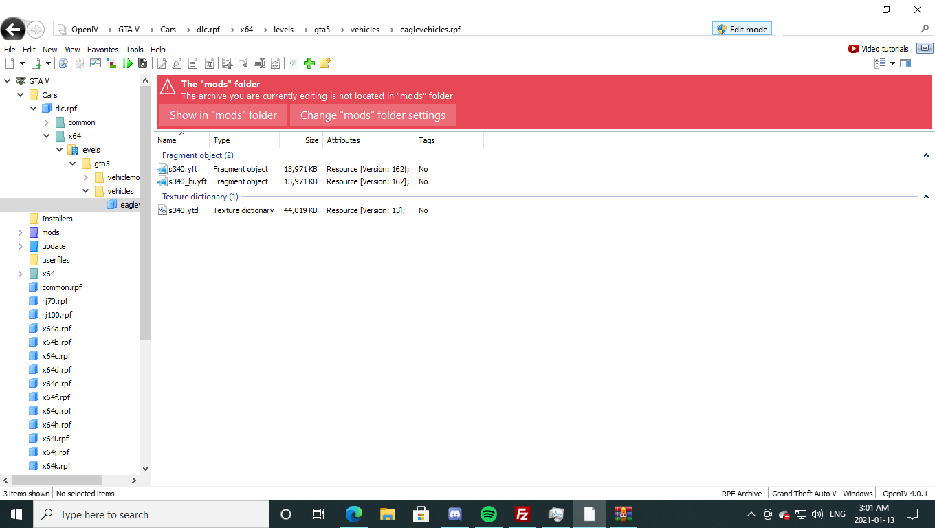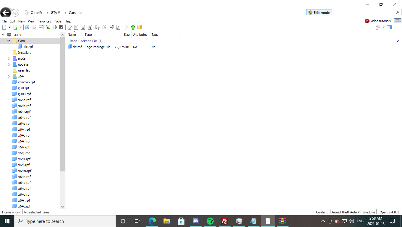- Create a Folder in OpenIV and just Call It ‘Cars’ and Open it! (Dont forget to Turn on Edit Mode Or We wont be getting Anywhere)