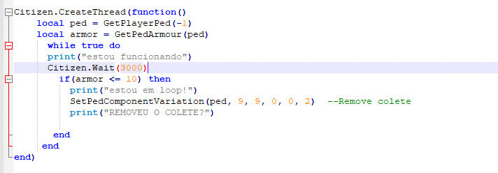 Before anything always try print(“test”) when you’re testing something if it works. As I see in your screenshot you have loop for checking if ped has armor. This might be causing some troubles. Im not perfect in LUA too but you should also try this: