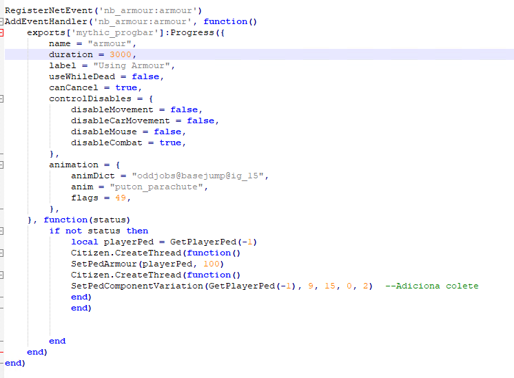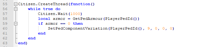 I’m creating a script and I was able to define when the player wears the armor item, run a progress bar along with animation and after the vest appears, everything works perfect. But I would like to add one more function when the armor goes back to 0 the vest disappears, I am using the native SetPedComponentVariation