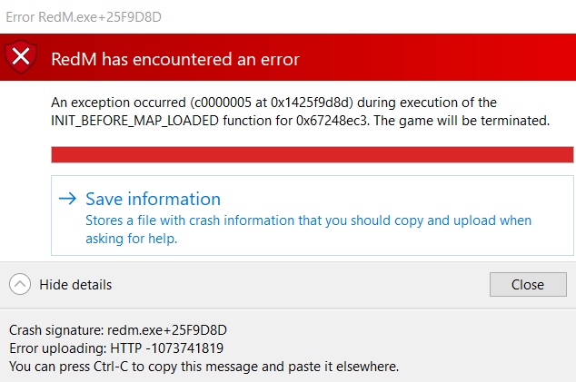 If an issue with starting: RDR2 folder screenshot RDR2/x64/dlcpacks screenshot Filepath to RedM folder RedM client folder screenshot Did you try to disable/uninstall your Anti-virus? Yes Did you start Rockstar Games Launcher not as admin? Yes