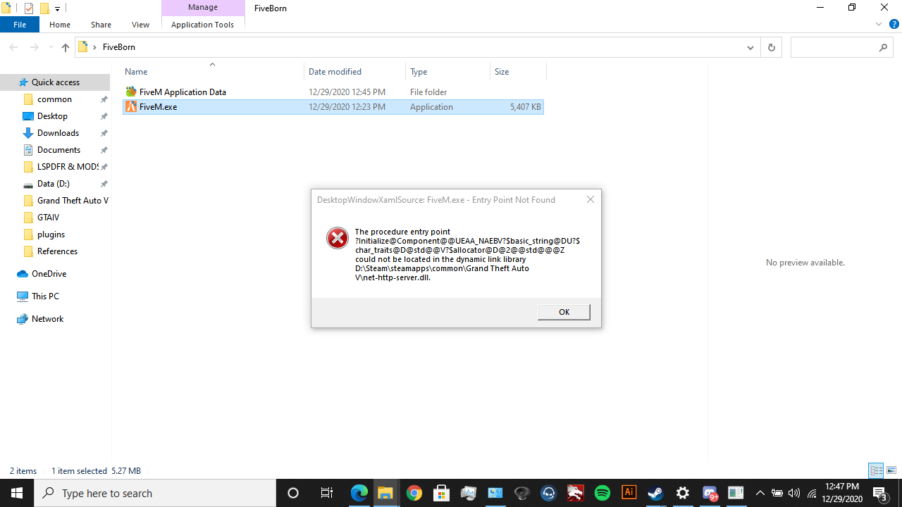 Ram: 12gb What did you do to get this issue? I tried installing the program using the FiveM.exe What server did you get this issue on? N/A CitizenFX crash zip file3e8dd05d-79d3-41ff-be27-9524d38bed0b.dmp (1.1 MB) CitizenFX.log fileCitizenFX_log_2020-12-29T204516.log (3.2 KB) .dmp files/report IDs