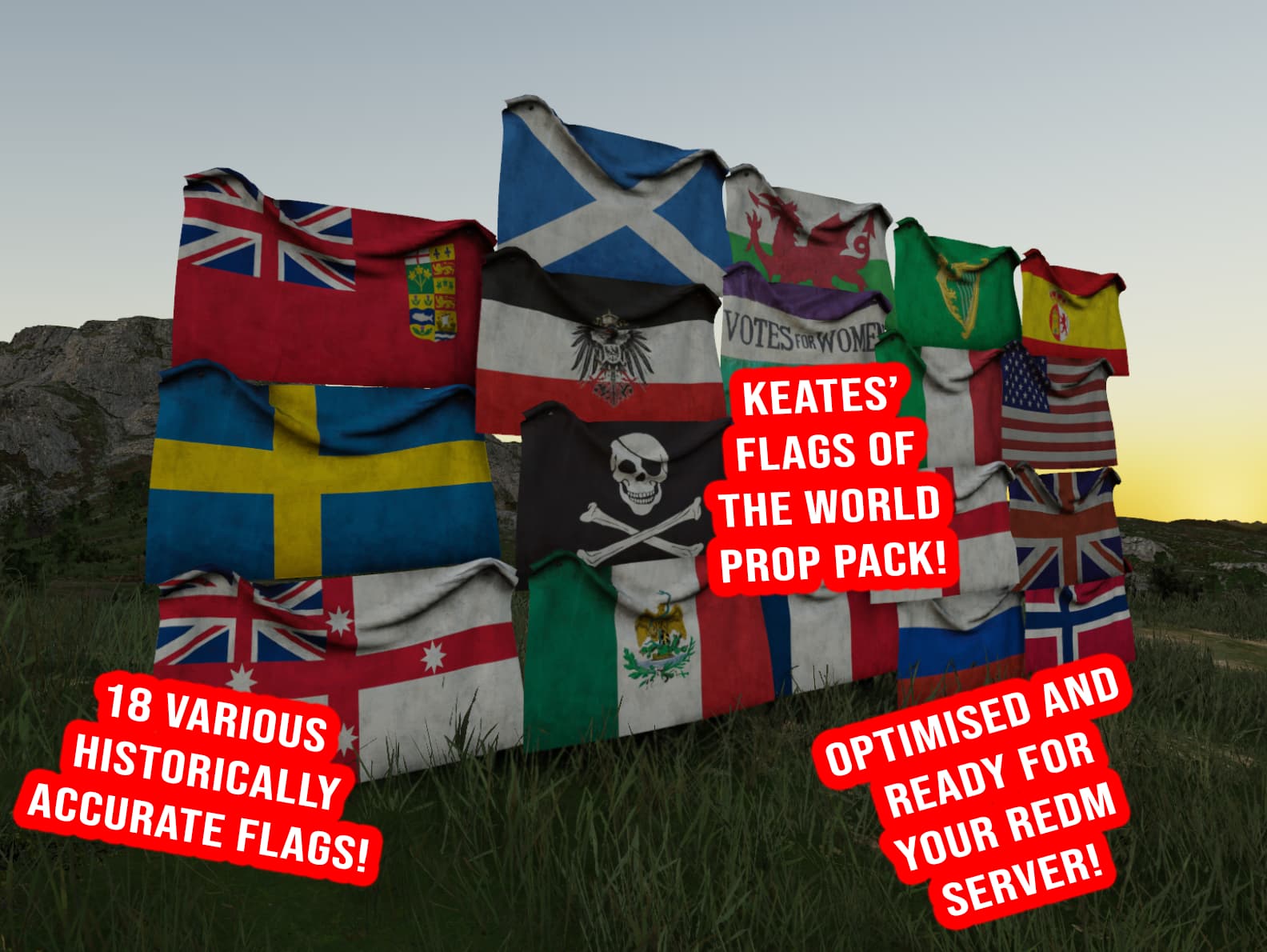Add global flair to your RedM server with this World Flags Prop Pack featuring 18 high-quality, optimized flag props. Perfect for towns, events, camps, and custom builds. These flags are perfect to place on walls using mapping tools or scripts and are compatible with various scripts that allow player placement of props.