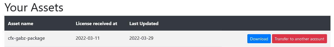 Hello, It would be nice if the Purchased Assets page had a column for when the script/pack was recently updated. Would help server owners a lot with when their scripts have had an update or hotfix.