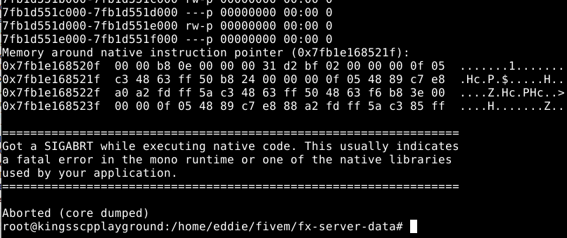 GTA V version? Linux server issue Up to date? Yes it is fresh download from official links Legit or Pirate copy? Legit Steam/CD/Social Club? Windows version? linux Did you try to delete caches.xml and try again? yes Error screenshot (if any) System specifications 8core E3 1270v5 What did you do to get this issue? while trying to start server for first time CitizenFX.log file .dmp files/report IDs