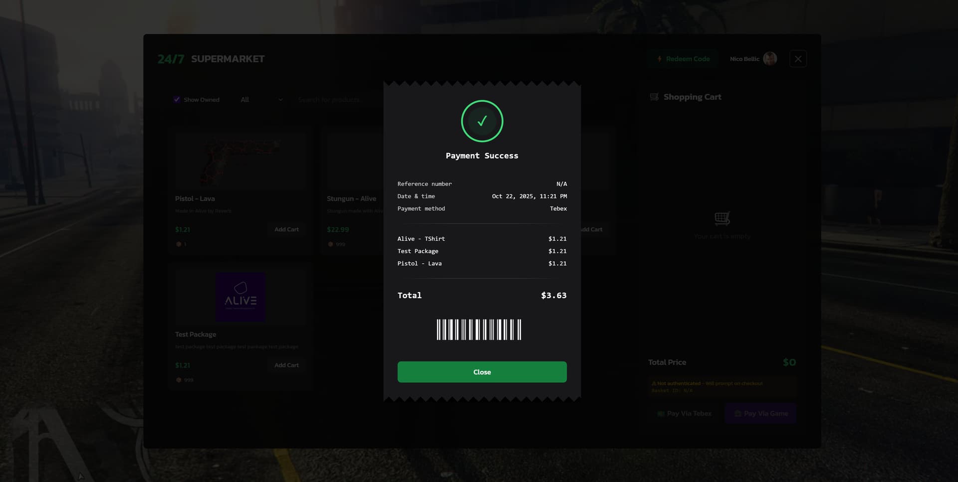 Alive Market is a lightweight, store-front resource for FiveM servers that integrates with Tebex (Headless API) to provide an in-game marketplace. It supports: