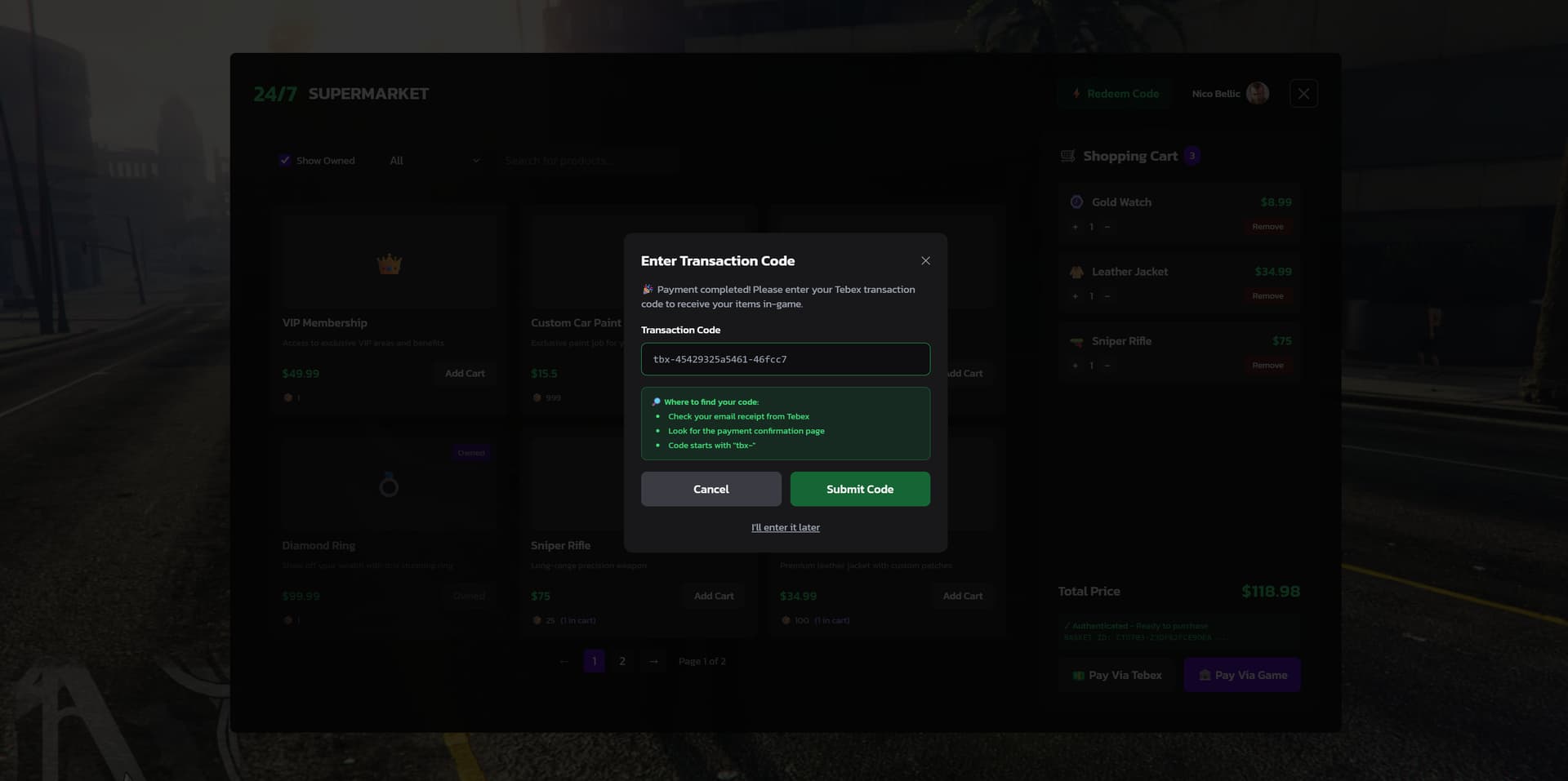 - Payment Flexibility: Support for Tebex payments (real money) AND in-game money transactions