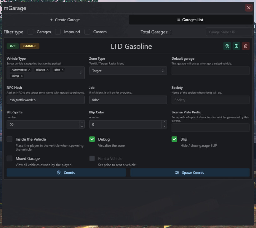 Create/edit Garages in game