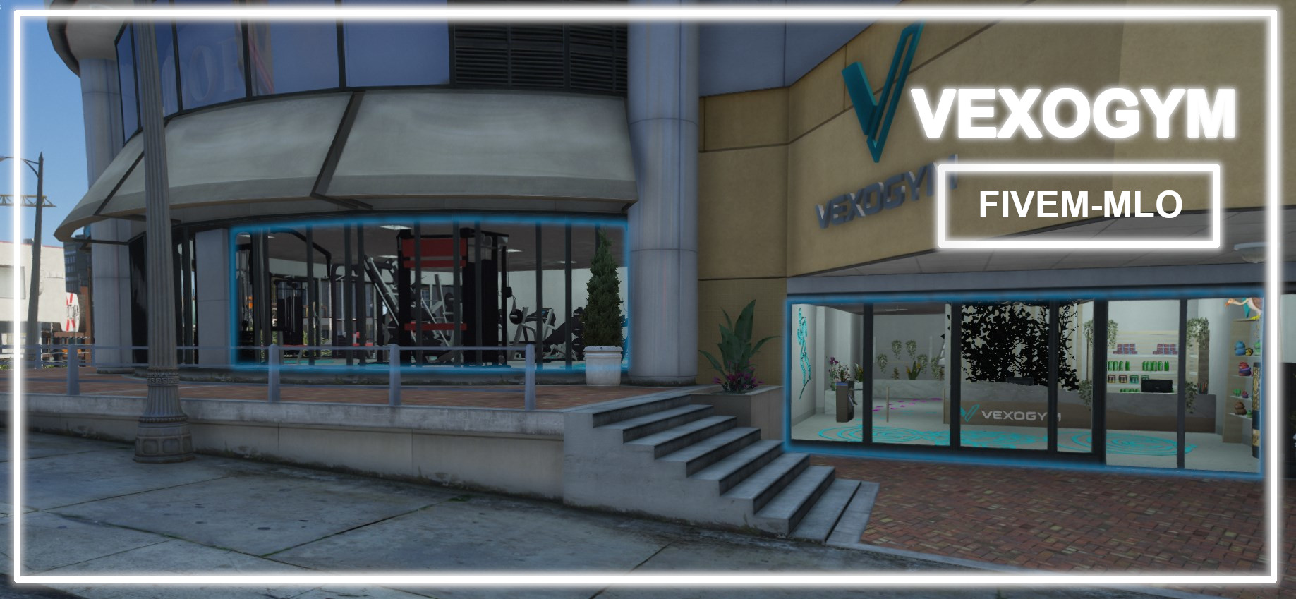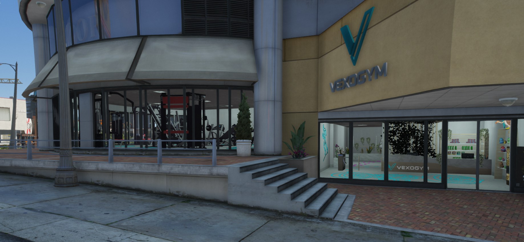 Vexo Gym is located in the center of Los Santos, inside a shopping mall. In addition to the main gym area, the interior includes a boxing room with a ring and a small space for yoga or dance. The interior itself features numerous decorative character figures — from dancers and boxers to runners.