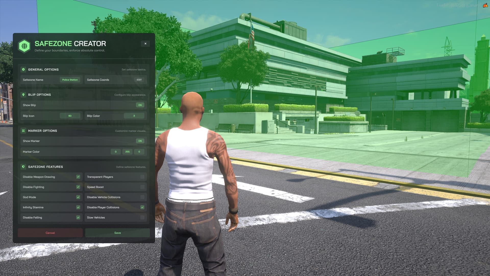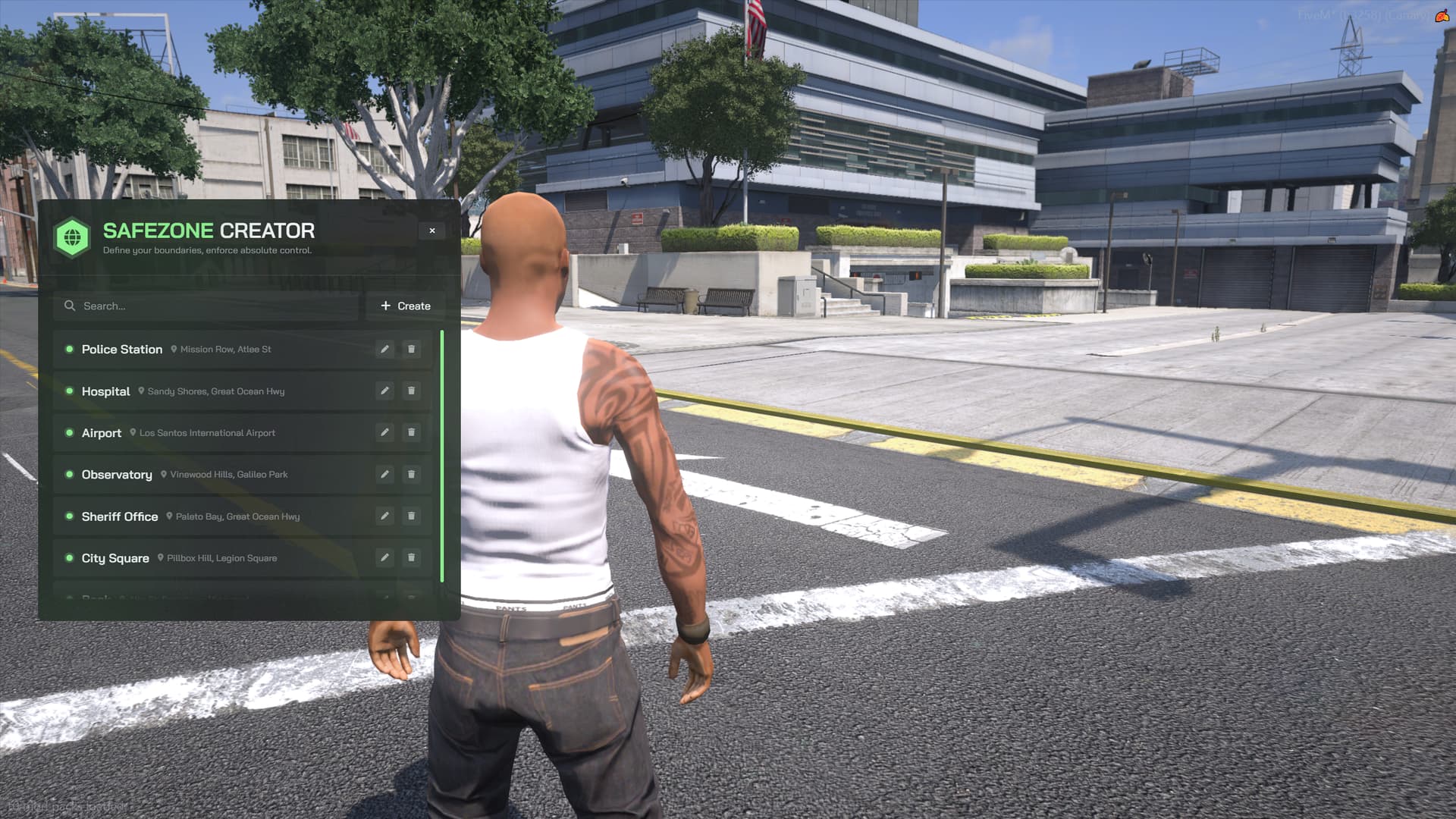 Create, edit, or delete as many safezones as you want, fully tailored to your server’s needs. Need a spawn protection area? A no-PvP zone at the hospital? A speed-limited area in the city center? You can set it all up in minutes directly from the in-game menu.