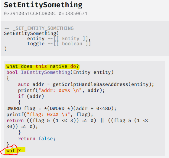What you need to keep in mind though, is that the native reference is pretty much a dump of decompiled natives, found by and documented by the community. So having a better documented reference is a “Collective” effort.