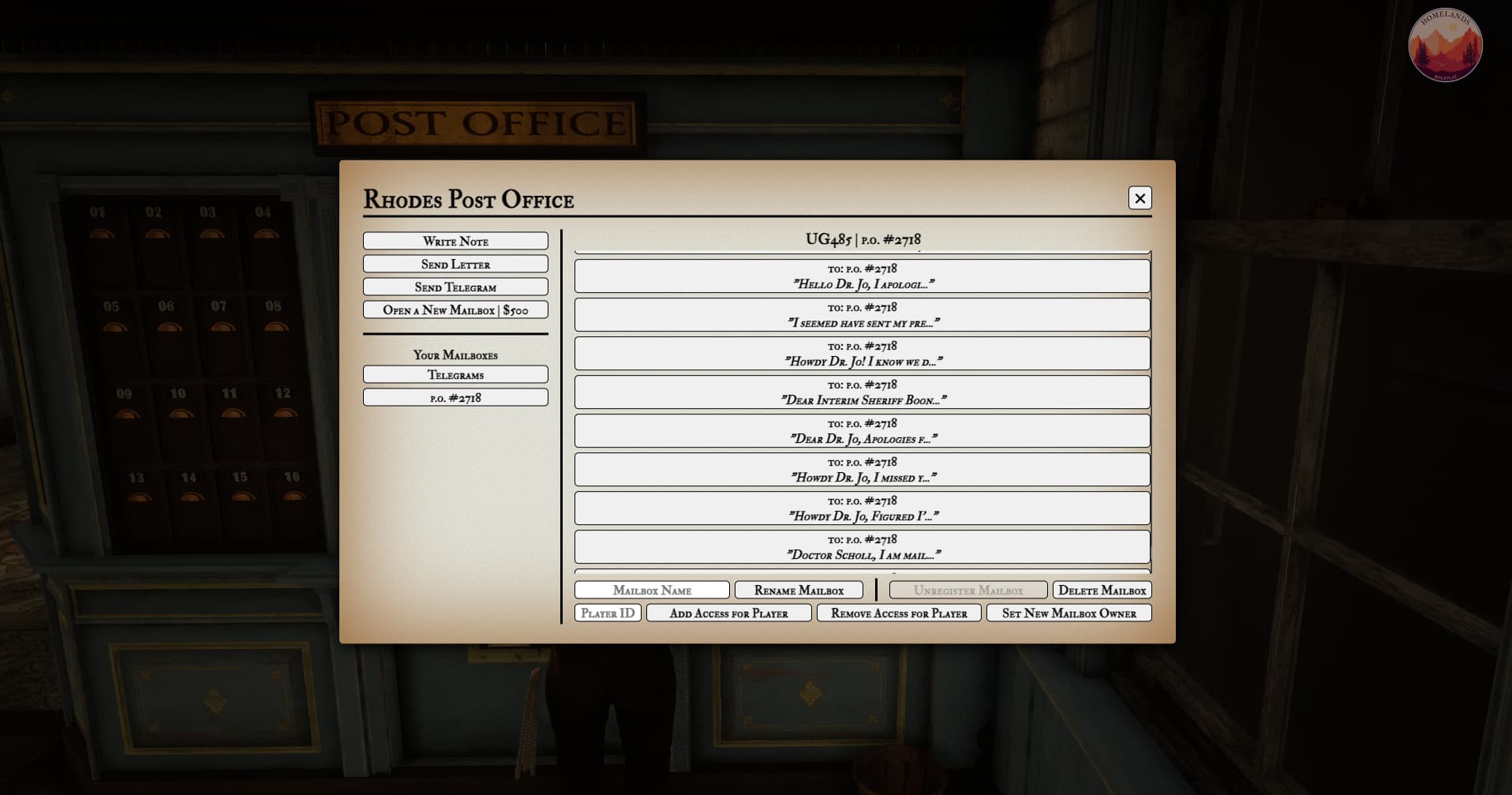 The Homelands RP server now features a fully overhauled mail system with letters, telegrams, physical collection, delivery speeds and costs, unique post office workers, mailbox management, and UI integration.