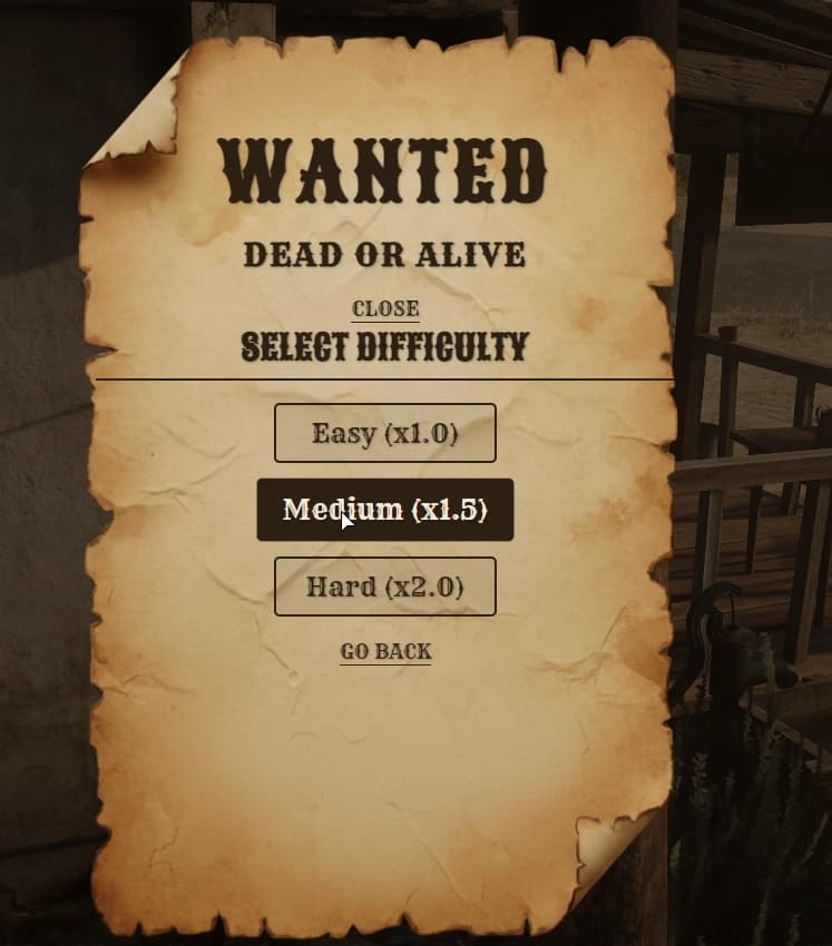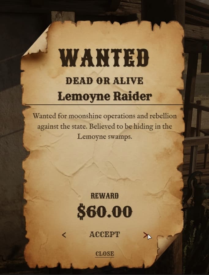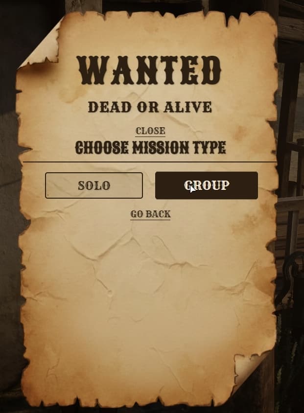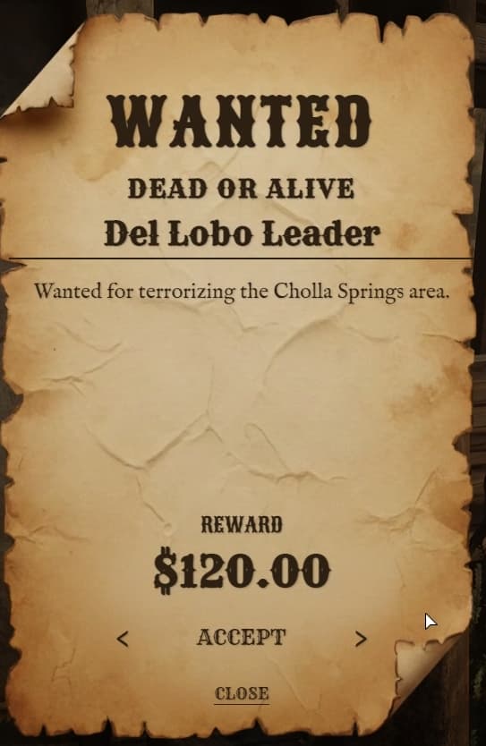 A beautifully crafted full-screen bounty poster with weathered paper textures, Old West typography, and smooth animations. Players browse available bounties directly on the poster.
