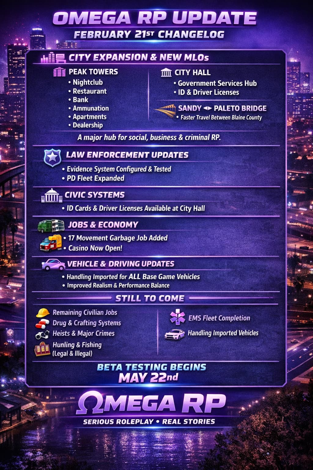 ᴏᴍᴇɢᴀ ʀᴘ ɪs ᴀ ᴄᴏᴍᴍᴜɴɪᴛʏ-ᴅʀɪᴠᴇɴ ʀᴏʟᴇᴘʟᴀʏ sᴇʀᴠᴇʀ ᴛʜᴀᴛ ʙʀɪɴɢs ᴛᴏɢᴇᴛʜᴇʀ sᴇʀɪᴏᴜs, sᴛᴏʀʏ-ғᴏᴄᴜsᴇᴅ ʀᴏʟᴇᴘʟᴀʏ ᴡɪᴛʜ ᴏᴘᴘᴏʀᴛᴜɴɪᴛɪᴇs ғᴏʀ ғᴜɴ, ᴄʀᴇᴀᴛɪᴠɪᴛʏ, ᴀɴᴅ ᴘʟᴀʏᴇʀ-ᴅʀɪᴠᴇɴ sᴛᴏʀʏᴛᴇʟʟɪɴɢ. ᴡʜᴇᴛʜᴇʀ ʏᴏᴜ ᴡᴀɴᴛ ᴛᴏ sᴇʀᴠᴇ ᴛʜᴇ ᴄɪᴛʏ ᴛʜʀᴏᴜɢʜ ʟsᴘᴅ ᴏʀ sᴀᴍs, ʙᴜɪʟᴅ ʏᴏᴜʀ ᴇᴍᴘɪʀᴇ ᴀs ᴀ ᴄɪᴠɪʟɪᴀɴ ᴏʀ ʙᴜsɪɴᴇss ᴏᴡɴᴇʀ, ᴄᴀʀᴠᴇ ᴏᴜᴛ ᴀ ɴᴀᴍᴇ ɪɴ ᴛʜᴇ ᴄʀɪᴍɪɴᴀʟ ᴜɴᴅᴇʀᴡᴏʀʟᴅ, ᴏʀ ᴄᴏᴍᴘᴇᴛᴇ ɪɴ ʀᴀᴄɪɴɢ ᴀɴᴅ ᴄᴀʀ ᴄᴜʟᴛᴜʀᴇ, ᴛʜᴇʀᴇ ɪs ᴀ ᴘʟᴀᴄᴇ ғᴏʀ ʏᴏᴜ ʜᴇʀᴇ.