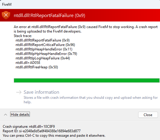 An error at ntdll.dll!RtlReportFatalFailure (0x9) caused FiveM to stop working. A crash report is being uploaded to the FiveM developers.