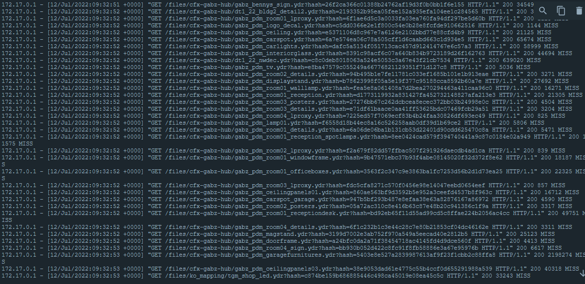 If the file is missing you get a MISS, and it reaches for the upstream host (your game server) to get the file. Once it gets the file, it will service it back to the original requestor as well as cache it locally for others.