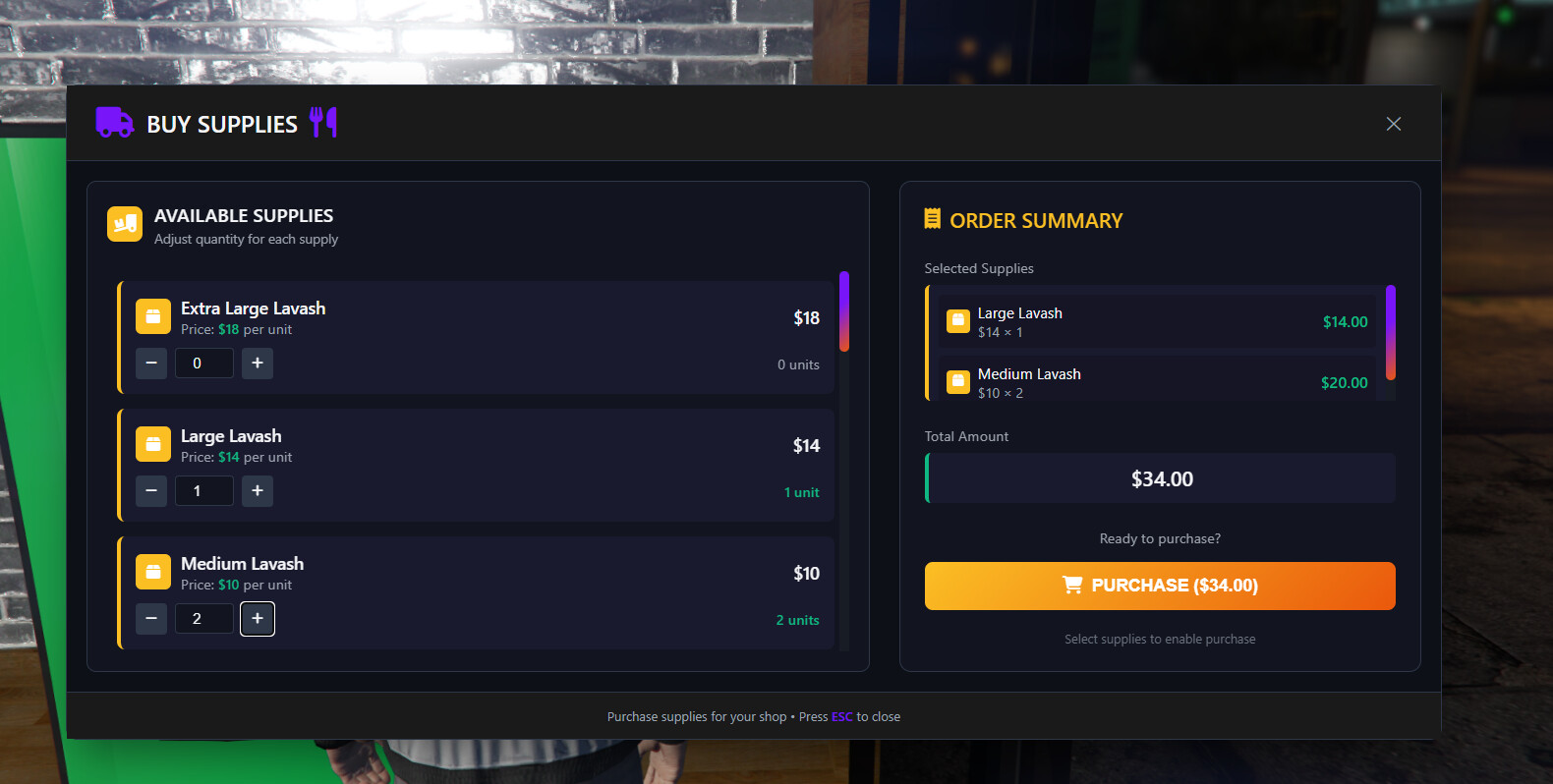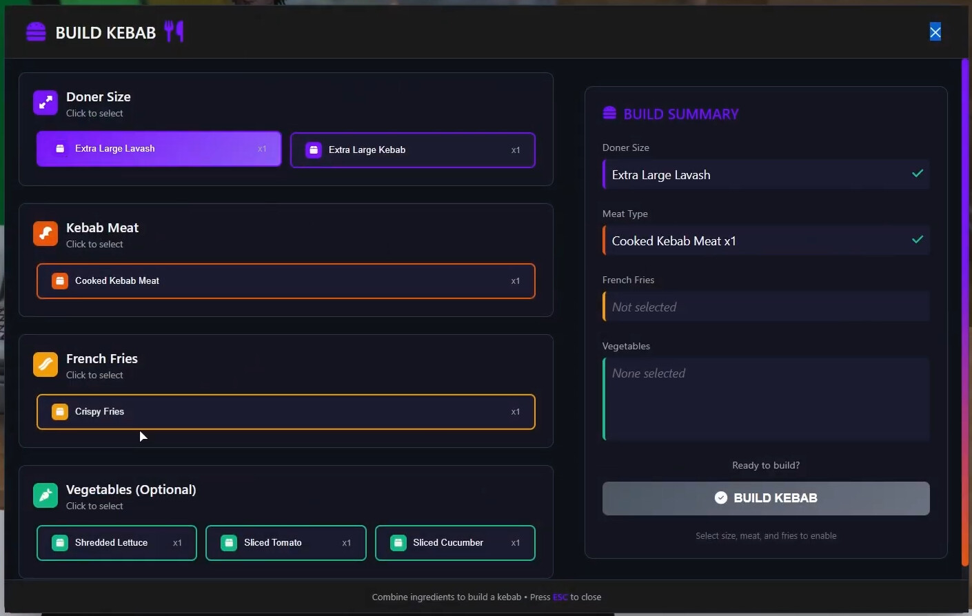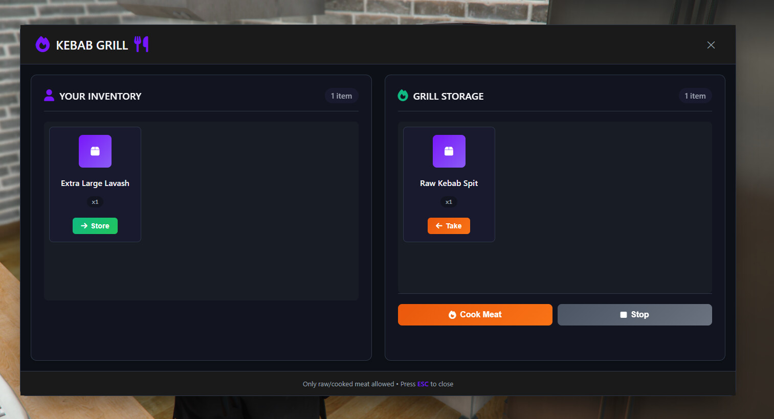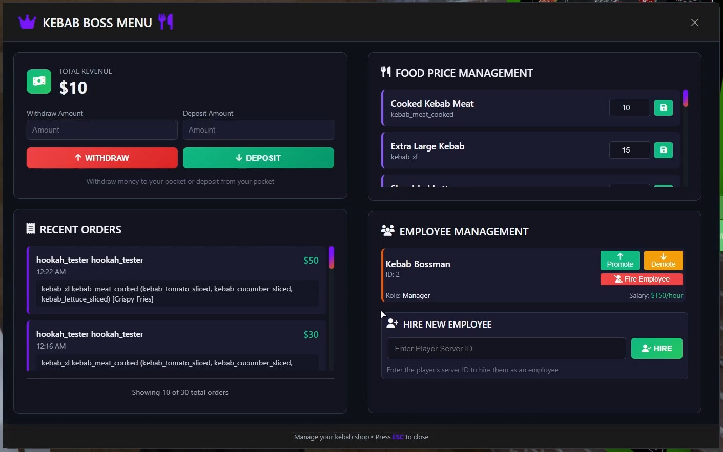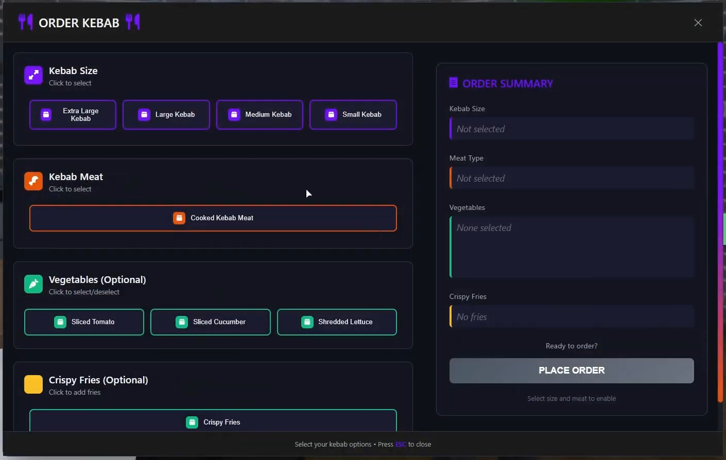 uKebab is a script designed to bring your server’s community together in one central hub. It’s the perfect way to encourage social interaction through the shared love of food while expanding your server’s economy with unique job opportunities.
