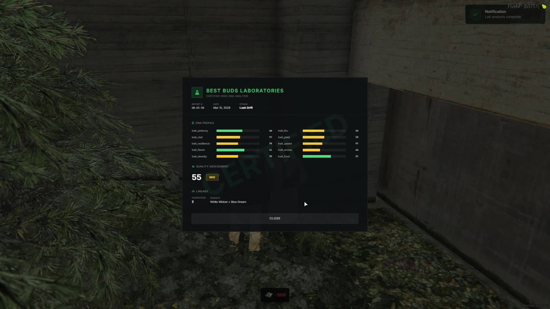 A 10-level progression system unlocks advanced mechanics like street selling, crossbreeding, scientist lab reports, seed cloning, and industrial freeze dryers. Illegal transactions use a configurable dirty money system, allowing servers to choose between framework accounts or inventory-based currency.