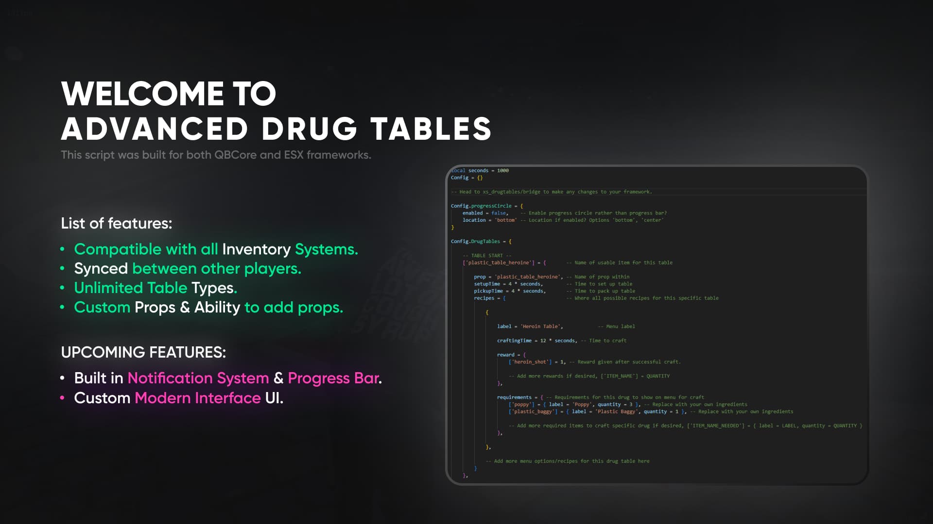-- Head to xs_drugtables/bridge to make any changes to your framework.