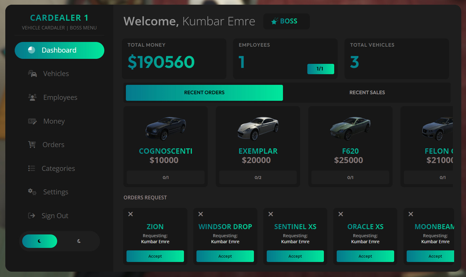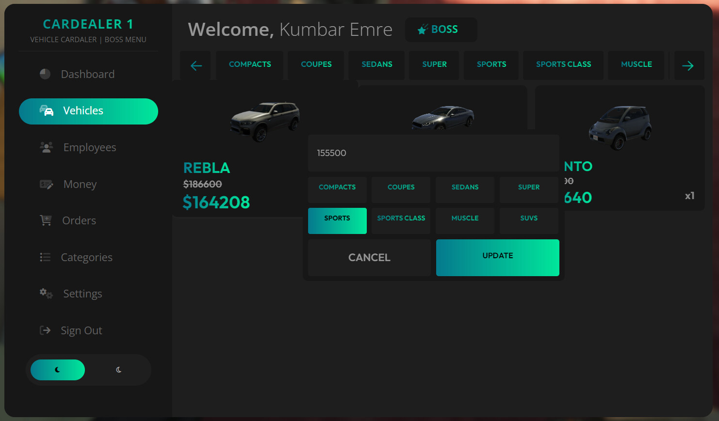 - The gallery owner, or the person who has access to the boss menu, can update the prices and categories of the vehicles.