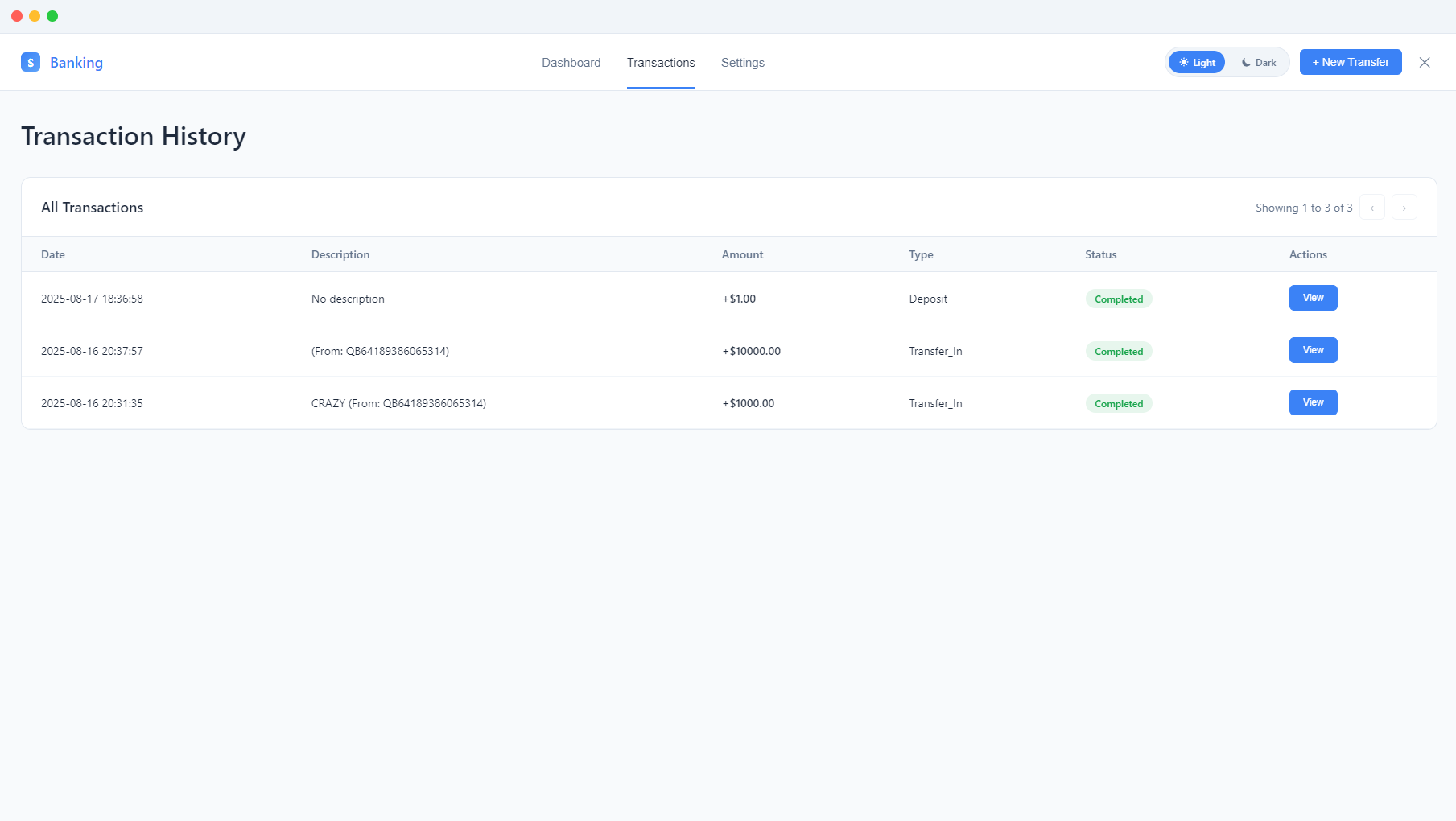 Transaction History & Pagination – Comprehensive transaction dashboard with filtering, pagination, and detailed view modals showing full transaction information including reference IDs and timestamps.