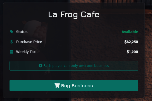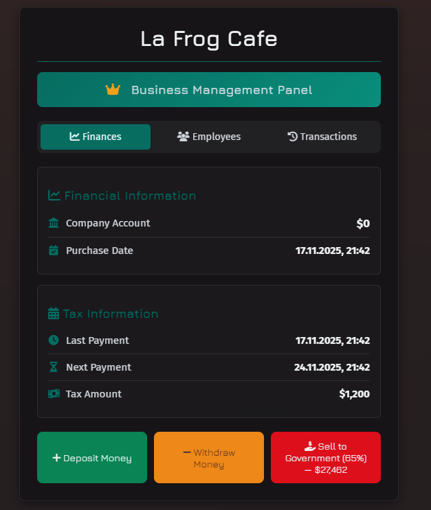 Players can buy businesses, hire employees, manage finances, and pay weekly taxes. The system includes 17 pre-configured businesses (cafes, restaurants, bars, nightclubs, mechanic shops) with full customization support.