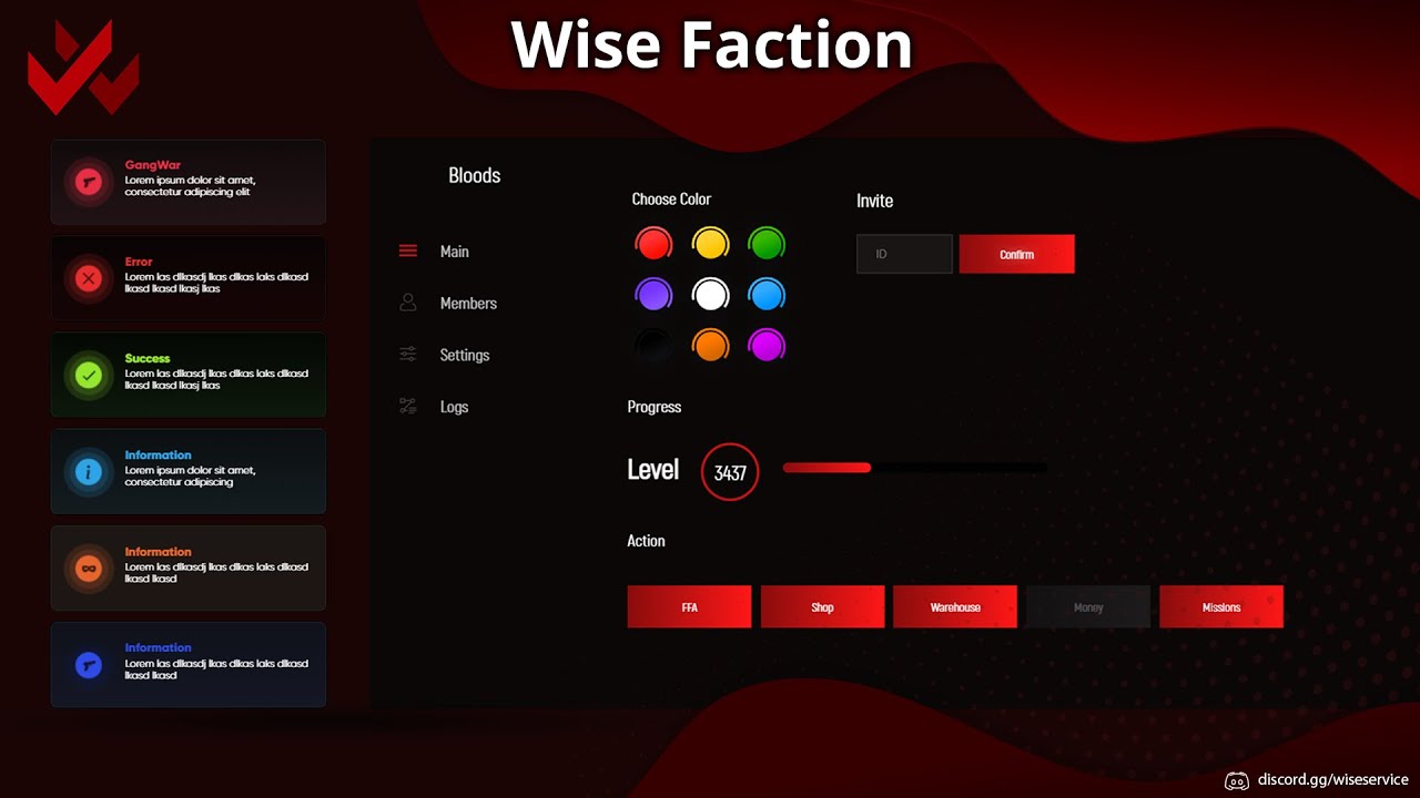 Main Tab , contains a Progress Bar and the Faction Level, an Invite Box, the Colors to choose from and Buttons to open the Factions Warehouse, Money, Shop, FFA