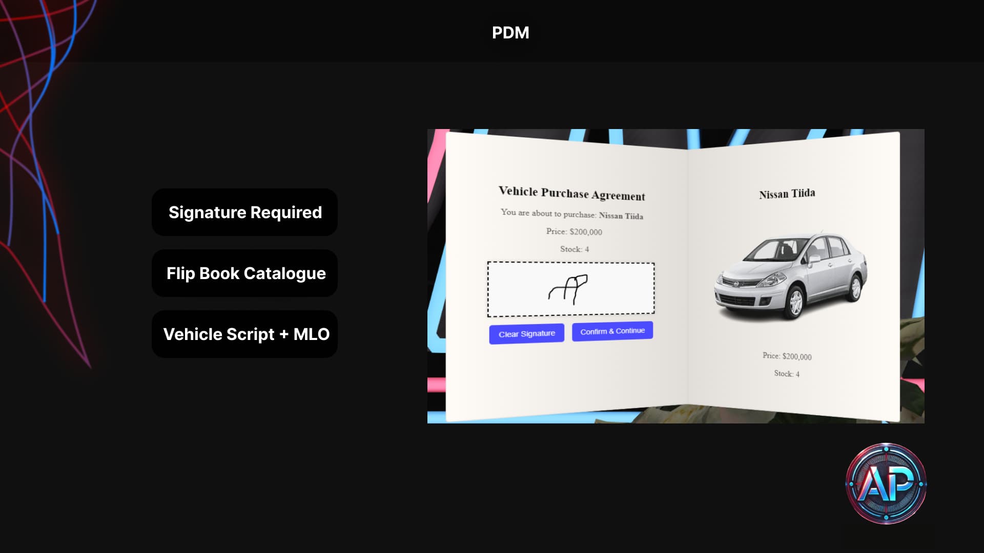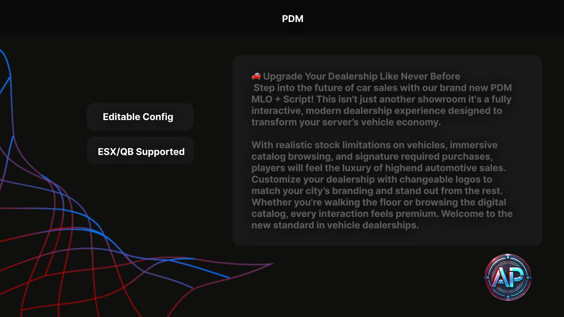 Revolutionize your FiveM car sales experience with our PDM MLO + Dealership Script a full package release that combines a beautiful custom MLO with a powerful vehicle sales system. Whether youβre managing stocks, showcasing exclusive rides, or customizing your showroom brand, this script is built to elevate your in game automotive experience.