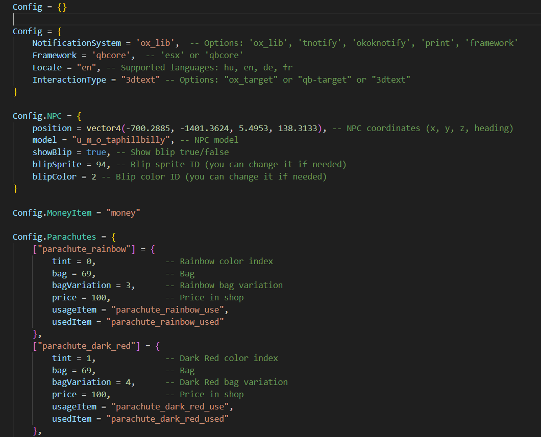 Bring dynamic realism to your RP server with this fully-featured parachute system , supporting both ESX and QBCore . Includes item-based parachute logic, skill-based folding, wear-and-tear mechanics, and an integrated NPC shop. Fully customizable and localized.